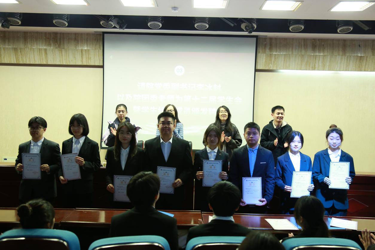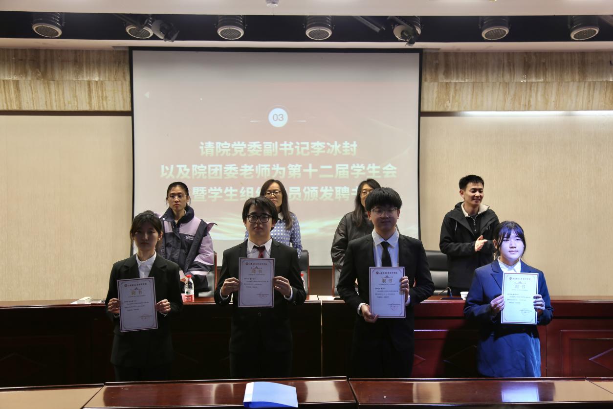 李冰封、王琦、秦小晴、谭春光分别为第十二届学生会暨学生组织成员颁发聘书。
