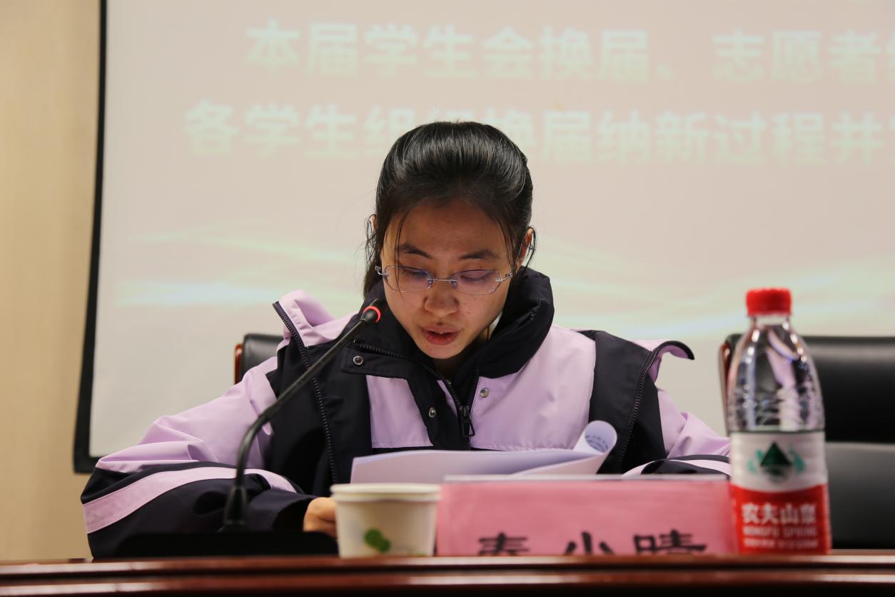 秦小晴介绍本届学生会、志愿者招募及各学生组织换届纳新工作,并宣布名单。