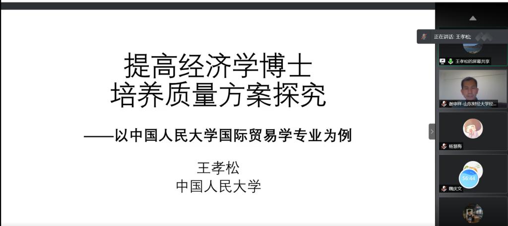 王孝松教授基于中国人民大学国际贸易学专业,就如何提高经济学博士培养质量方案进行了讲解。王教授分别从培养方式、主要培养环节的学习进度要求,中期考核、选拔与退出机制等方面的近期改革做了阐述,并对数理方法和软件,理论学习和论文写作脱节,前沿性和系统性等方面存在的不足进行了深入思考与分析,为提升博士培养质量提供了良好的借鉴。