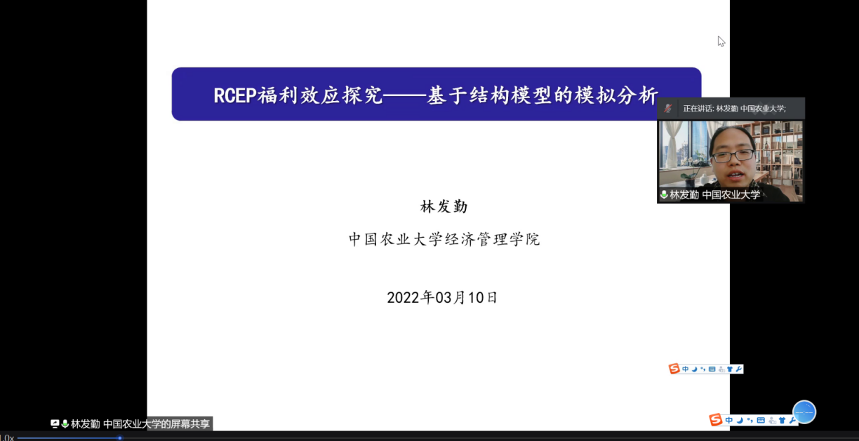 本次报告主题是“RCEP的福利效应-基于结构模型的测算”。围绕这一主题,林发勤教授从引言、理论模型、数据和模拟策略及估计结果四个方面由浅入深的阐述了RCEP引致的关税削减代表的贸易成本与福利之间的相关关系。