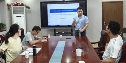 尹鹏辉博士以“Diagnostic Expectations and Consumption Dynamics”为题做报告。家庭调查数据显示,正向收入冲击会提高当前消费,但会降低未来消费。这一现象与理性预期下的永久收入假说相矛盾。文章表明,引入诊断性预期能够解释这一消费之谜。与会期间,基于预期对宏观调控政策效果的影响,学者们展开深入讨论,收获颇丰。