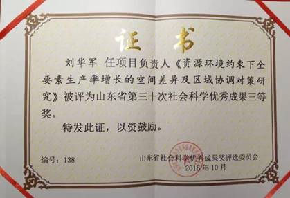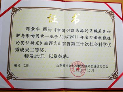 近日,山东省第三十次社会科学优秀成果获奖名单正式公布。我院有4项研究成果获奖,其中,陈景华撰写的论文《中国OFDI来源的区域差异分解与影响因素——基于2003~2011年省际面板数据的实证研究》获得二等奖。刘华军任项目负责人的《资源环境约束下全要素生产率增长的空间差异及区域协调对策研究》,获得三等奖。