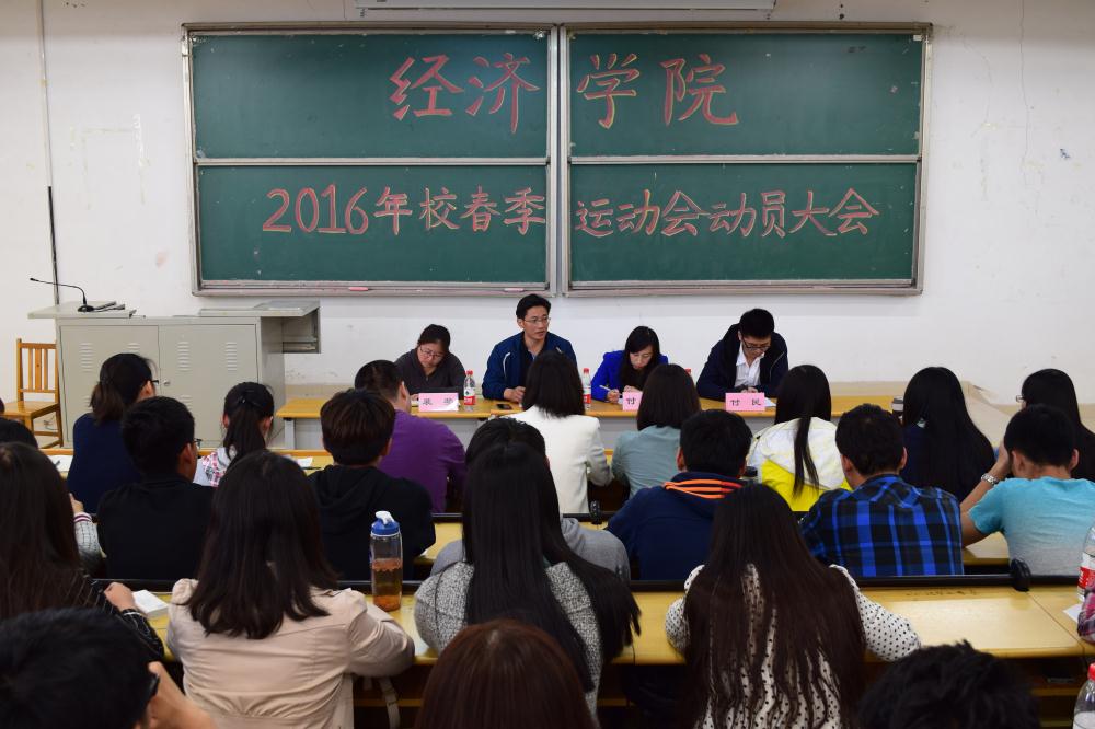 (通讯员:周姝含 李雨桐)4月18日12:30,经济学院于圣井校区敏行楼B5-301教室召开2016年校春季运动会动员大会。经济学院党委副书记任海伦、辅导员付雯、裴斐出席会议,学院全体运动员、啦啦操队员、工作人员、方阵队员参加会议。会议由裴斐主持。