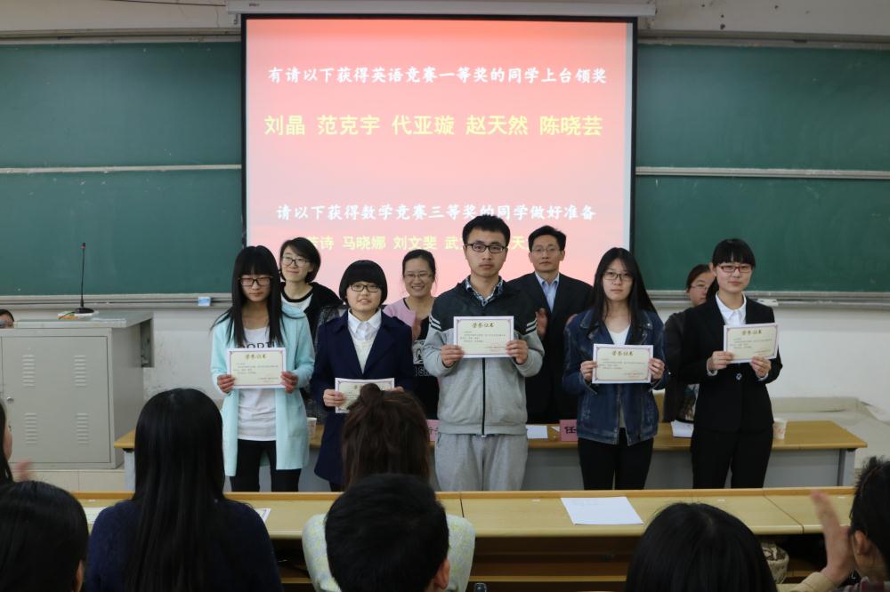 3月21日中午12:30,经济学院第一届大学生英语、数学竞赛颁奖典礼于圣井校区敏行楼B5-301教室顺利举行。经济学院党委副书记任海伦,院团委书记兼学工办主任周新秀,辅导员裴斐、王琦老师出席典礼。获奖同学和我院14、15级各班学生参加,颁奖典礼由周新秀主持。