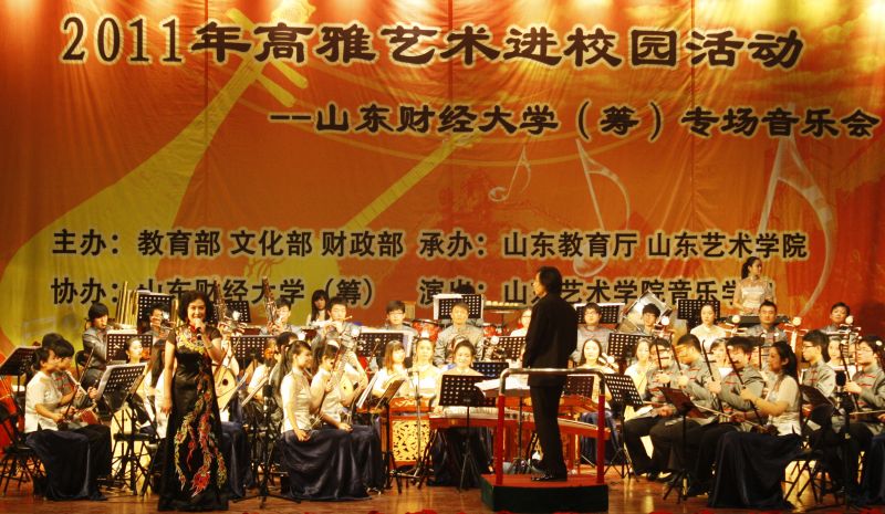 11月25日晚,由教育部、文化部、财政部主办的2011年高雅艺术进校园活动在舜耕校区礼堂举行。山东省教育厅体卫艺处任兰平、张德珠处长,山东艺术学院党委书记任运河、副院长王力克,我校党委书记郝书辰,党委副书记、纪委书记牟思伦,副校长崔友平和有关部门负责人、我校近千名学生一同参加了本次活动。 山东艺术学院青年民族乐团演奏了《春节序曲》、《瑶族舞曲》、《十面埋伏》、《长城随想》、《沂蒙畅想曲》等著名曲目。音乐节奏或热烈欢快,或柔和细腻,让人如痴如醉。特邀指挥马海龙先生现场讲解民族器乐,展现音乐魅力,赢得师生阵阵喝彩。山东艺术学院音乐学院王世慧教授演唱的《沂蒙山小调》,歌声高亢清脆,唱出了山东民歌的神韵。吴侃教授演唱著名歌曲《母亲》,感情真挚、沁人心脾。整场音乐会典雅清新、高潮迭起、掌声雷动。 “高雅艺术进校园”活动是由国家教育部、文化部、财政部联合倡议、扶持,自2006年展开以来,以高雅的经典曲目、剧目为主要演出内容,把代表人类优秀文化成果的艺术作品送进校园,秉承弘扬优秀民族文化的宗旨,意在丰富校园文化生活,感悟经典文化,提高学生艺术修养,让其可以更好地融入到高雅艺术的世界中来。