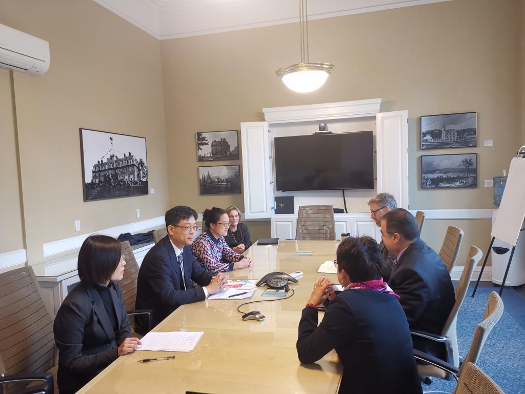 新布伦斯瑞克大学校长Dr. John A. Kershaw、文学院院长Dr. Joanne Wright、经济学院院长Dr. Luc Theriault和继续教育学院院长Ms. Colleen Meagher等领导会见了我院代表,双方进行了友好交流,就深入合作进行了交谈。姜伟书记代表学院发表讲话,高度赞赏了新布伦斯瑞克大学享有的学术声誉以及人才培养、交流合作方面的先进理念,同时介绍了我校近况及国际化需求。山东财经大学和新布伦斯瑞克大学自2013年开始合作以来,在学生培养、教师互访以及学术交流方面取得了骄人的成就,截至今年,我们的合作项目已培养6批共28名硕士毕业生,其中有6人分别到阿尔伯塔大学、卡尔加里大学、曼尼托巴大学等继续攻读博士学位,部分毕业生留在加拿大工作,还有一些回到国内在一些著名跨国公司、企业工作。我们学校也有一些老师通过在新布伦威斯克大学访问,提升了自己的能力,拓宽了眼界。六年的合作,双方都取得了很大的收获,希望将来我们可以在更多更深的领域继续合作。