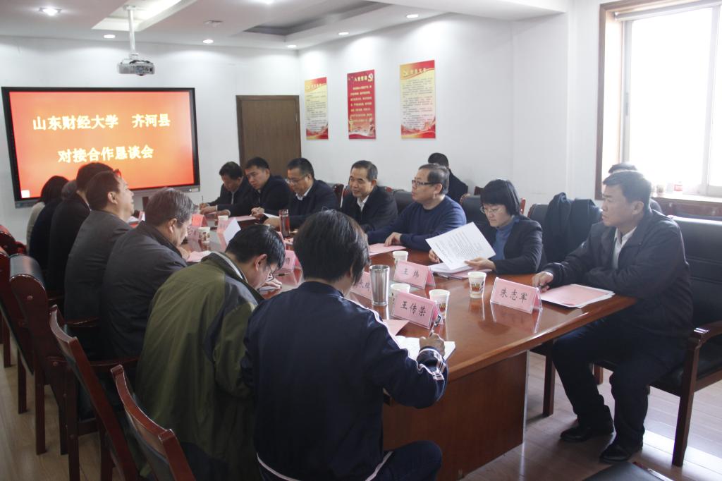 2019年11月18日,山东财经大学与齐河县合作对接交流会在舜耕校区办公楼1208顺利举行。齐河县委副书记董庆新、齐河祝阿镇省派乡村振兴服务队队长韩京安一行7人,山东财经大学党委副书记车滨、机关党委书记李孟顺、经济学院党委书记姜伟、院长董长瑞教授和乡村振兴研究院负责人等8人参与本次会议,会议由姜伟主持。