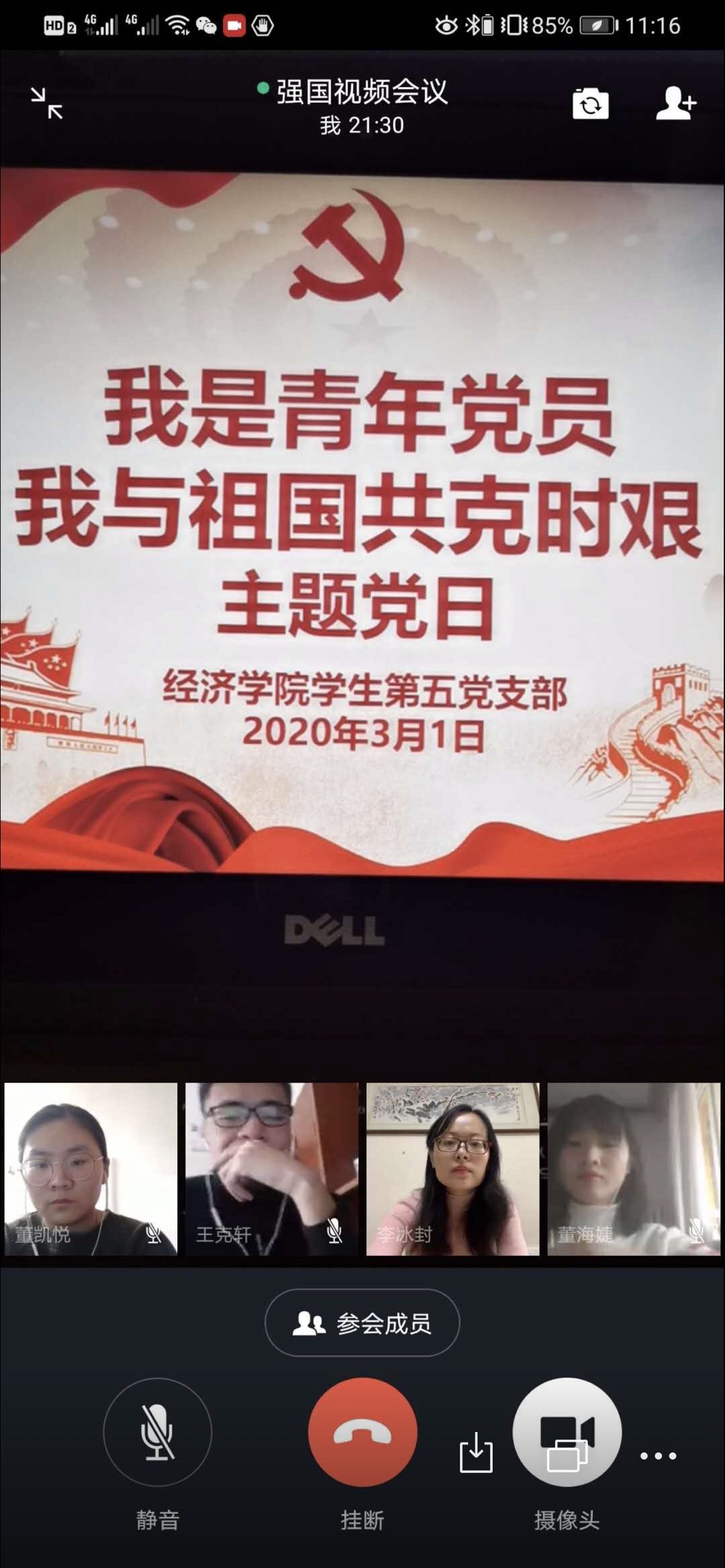 视频会议上,各党支部书记首先向奋战在教学准备一线的教工党员和严守在家的学生党员们致以问候,向全体党员介绍了学校疫情防控工作的各项举措,要求全体党员要认真学习党中央和学校有关新冠肺炎疫情防控期间的有关文件和通知,落实党中央和学校疫情防控部署,坚决打赢疫情防控阻击战。接着,支部书记带领大家学习了习近平总书记在统筹推进新冠肺炎疫情防控和经济社会发展工作部署会议上的重要讲话。每位党员结合讲话精神在线上展开了热烈的讨论和发言。“我是青年党员,我与祖国共克时艰”、“抗击疫情,从我做起”、“践行初心战疫情,共克时艰勇担当”、“凝心聚力战疫情,共克时艰显担当”、“克明峻德众志成城,青年党员共抗疫情”、“战疫情、学英模”、“共抗疫情,共同行动,勇当先锋”、“抗击疫情齐聚力,共克时艰守初心”、“践初心勇担当,强信心战疫情”、“‘疫’线承诺唤初心,共克时艰担使命”、“疫情防控期间做好本质工作”,12个教工和学生党支部用不同的主题唱出了党员同志们共同抗击疫情的强烈呼声,不仅道出了对抗疫一线英雄们的关爱和祝福,也展示了师生党员强烈的责任感和使命感。最后各支部书记传达中央和学校号召,倡议全体党员积极行动起来,自愿捐款同心抗疫。全体党员通过网络表达了对一线抗疫英雄的祝福,并以实际行动积极响应党的号召踊跃捐款,传递实实在在的温暖,为抗击疫情奉献自己的绵薄之力。经济学院党委共计自愿捐款17558元。