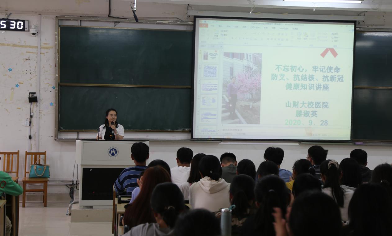 (通讯员:冯源 许佳璇)为有效落实疫情防控工作,帮助新生树立健康意识,养成良好生活习惯,尽快适应大学生活,9月28日15:30,经济学院于圣井校区敏行楼举办2020级新生传染病防控与健康知识讲座。讲座特邀山东财经大学校医院副院长滕淑英主讲,院团委书记、新生辅导员付雯出席会议,经济学院2020级全体新生参加。