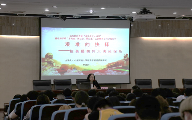 (通讯员:付雯 韩云昕)为深化学院党史学习教育,弘扬伟大的抗美援朝精神,5月14日下午,经济学院于圣井校区敏行楼举办学校成长成才大讲堂暨“学党史、强信念、跟党走”主题教育党史报告会。报告会由经济学院党委副书记李冰封主讲,院学工办主任裴斐、团委书记付雯、党委专职组织员王琦出席报告,经济学院2018级、2019级、2020级部分党员、入党积极分子和团员青年参加,报告会由裴斐主持。