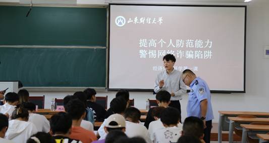 (通讯员:韩云昕)为预防新型电信诈骗,防止大学生被诈骗事件发生,打造安全、舒适、快乐的学习环境,9月9日下午,经济学院邀请章丘区圣井街道办事处派出所所长解学峰,副所长孟祥芳,街道办事处团委副书记魏山淼来校开展“提高个人防范能力,警惕网络诈骗陷阱”防诈骗宣讲活动,经济学院学工办主任裴斐,就业办主任朱海林出席会议,圣井校区19、20级部分同学参加会议。