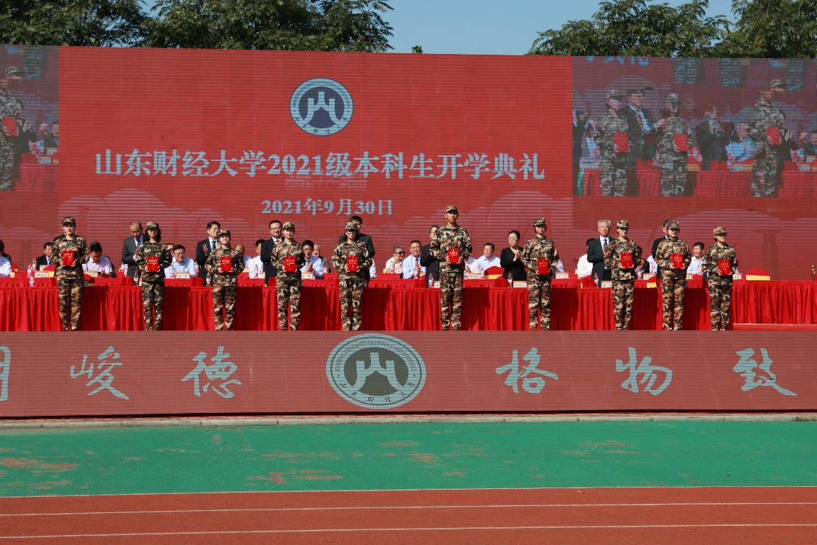 9月29日上午,山东财经大学2021级新生开学典礼在圣井校区隆重举行。军训团政委、校党委学生工作部、学生工作处处长王剑宣读了《关于表彰2021年国防教育先进集体、优秀军训学生、优秀教官的决定》。经济学院被评为“军训工作先进单位”,朱海林被评为“国防教育先进工作者”,矫宇航、颜瑜凡被评为“优秀志愿者”,王泽栋等26名同学被评为“优秀军训学生”。