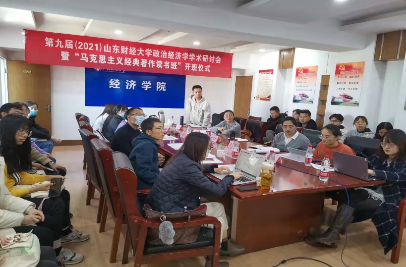 2021年11月13日,“第九届(2021)山东财经大学政治经济学学术研讨会”暨“马克思主义经典著作读书班”开班仪式,在山东财经大学经济学院召开。本次会议以“马克思主义政治经济学研究:重温经典与面向未来”为主题,采取线上线下相结合的方式,中国社会科学院、南开大学、中国人民大学、复旦大学、浙江理工大学、上海工程技术大学和山东大学等国内知名学者参会,并作主题演讲。