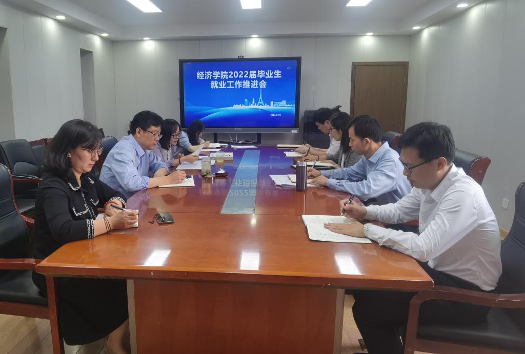 (通讯员 李冰封)为贯彻落实《山东财经大学关于进一步做好2022届毕业生就业工作的通知》,帮助毕业生树立正确的就业观、择业观,切实解决毕业生求职中的实际问题,进一步推进学院就业工作,5月19日,经济学院召开2022届毕业生就业工作推进会,党委书记姜伟、院长谢申祥、党委副书记李冰封、陈静,副院长崔宝敏、张明志,办公室主任马祥振、行政秘书王元、本科毕业班辅导员王琦参加会议。