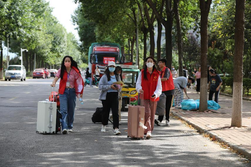 学生辅导员恪尽职守,为省外报到新生验证缴费、发放校园卡、宿舍钥匙等,帮助新生了解报到流程,并热心为新生答疑解惑,提高效率。引导员负责引领新生购买军训和卧具用品,搬运行李,悉心为新生介绍校园环境,以助新生更快适应大学生活。工作人员各司其职,无私奉献,迎生现场秩序井然。