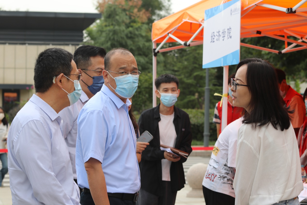 校党委副书记张培国在校党委学生工作部部长、学生处处长杨哲,保卫处处长徐明春的陪同下莅临我院迎新现场,了解经济学院新生报到情况,对经济学院迎新工作人员的精神风貌、工作态度给予高度肯定,同时对疫情防控、报到流程、服务态度等提出指导性意见。
