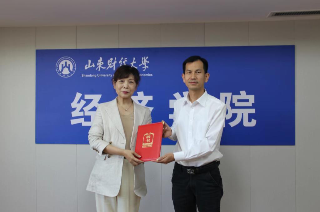 谢申祥副校长向郑静总经理颁发山东财经大学经济学院客座教授聘书