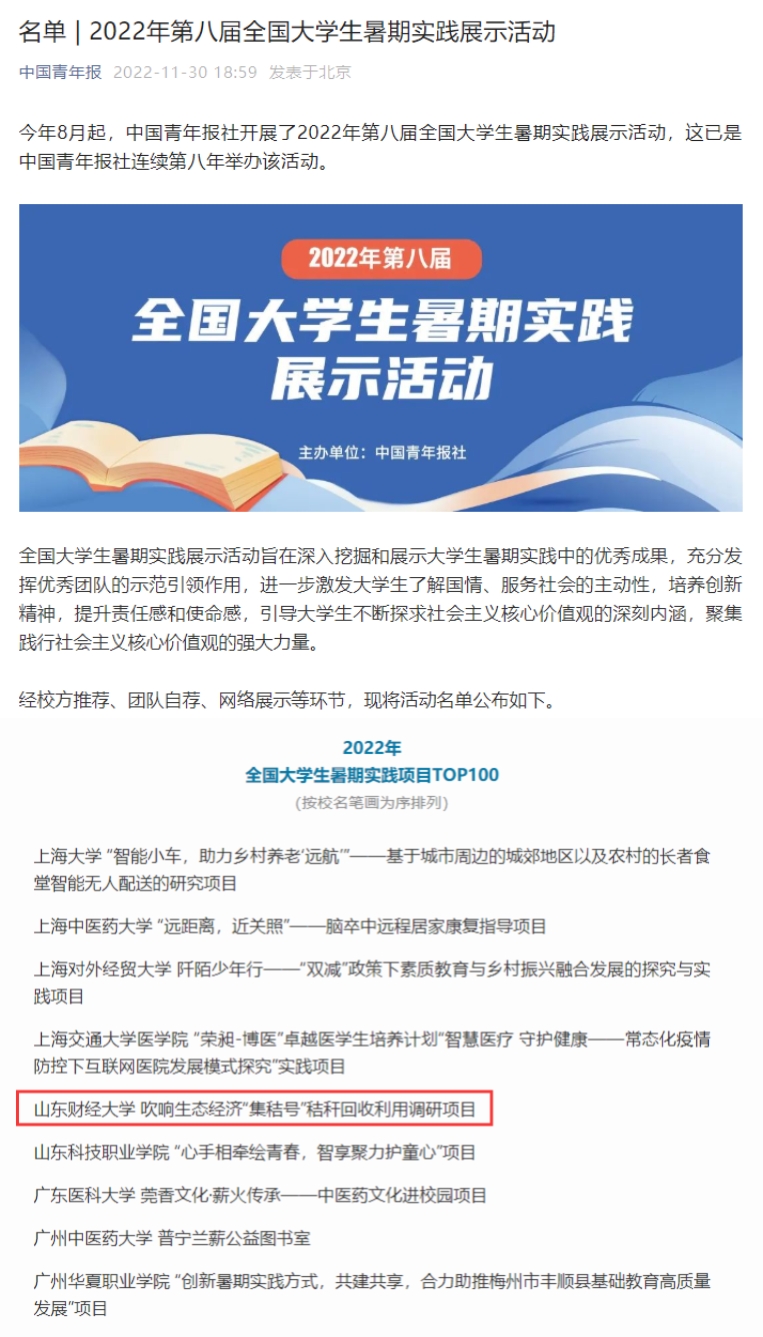 近日,中国青年报公布了2022年第八届全国大学生暑期实践展示活动全国百强,山东财经大学经济学院“吹响生态经济‘集秸号’——双碳战略下基于鲁、苏、冀、蒙秸秆回收各主体交易现状对秸秆原料供应链的调查研究”项目作为我校推荐的唯一项目类团队,经校方推荐、团队自荐、网络展示等环节,成功入选全国大学生暑期实践项目TOP100。