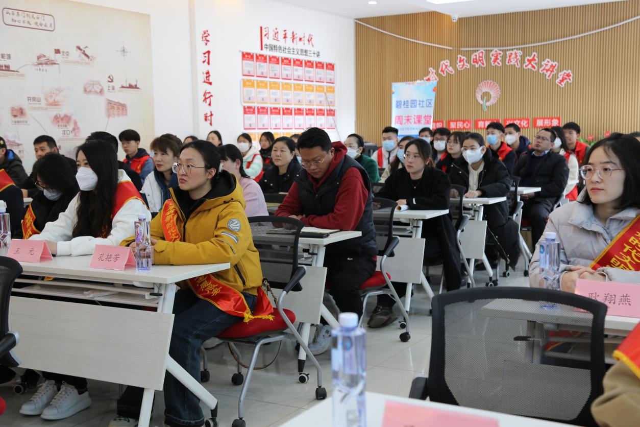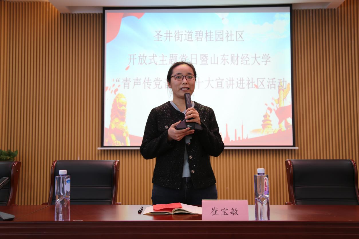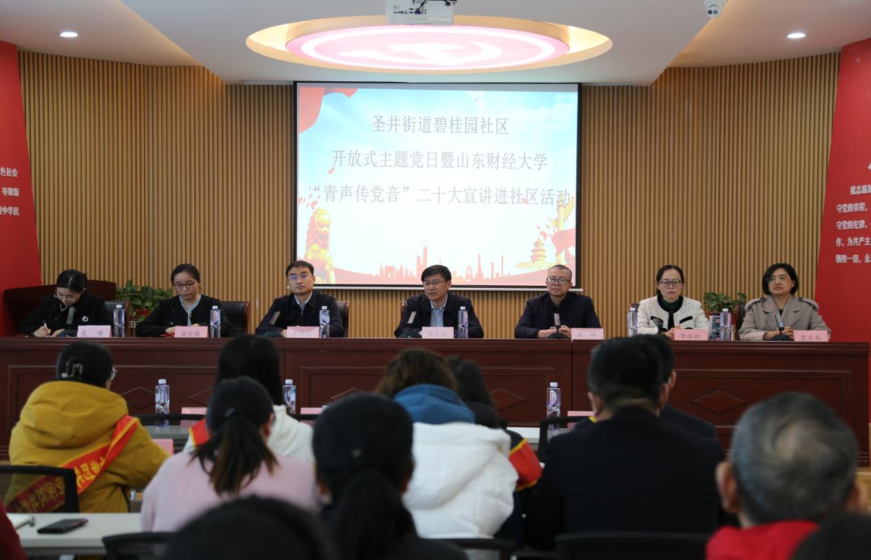 为深入学习宣传贯彻党的二十大精神,贯彻落实习近平总书记关于青年工作的重要思想,深入推进党的二十大精神在基层落地生根、见行见效,发挥广大团员青年参与社会治理的生力军和突击队作用,2月26日下午,山东财经大学经济学院“菁彩”青春网格员志愿服务队赴圣井街道碧桂园社区开展“青声传党音”二十大宣讲进社区志愿服务活动。山东财经大学乡村振兴研究院院长董长瑞,圣井校区管理办公室党委书记高峰,圣井街道党工委书记李宝光,经济学院党委副书记李冰封、副院长崔宝敏,圣井街道党工委委员、党建办副主任吴臻出席活动。经济学院师生代表和碧桂园社区全体直管党员参与活动。宣讲会议由吴臻主持。