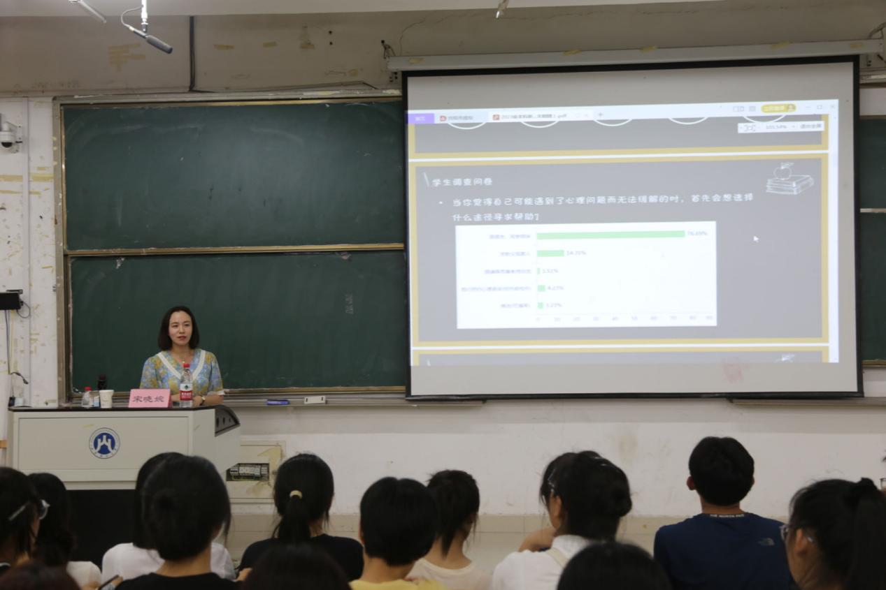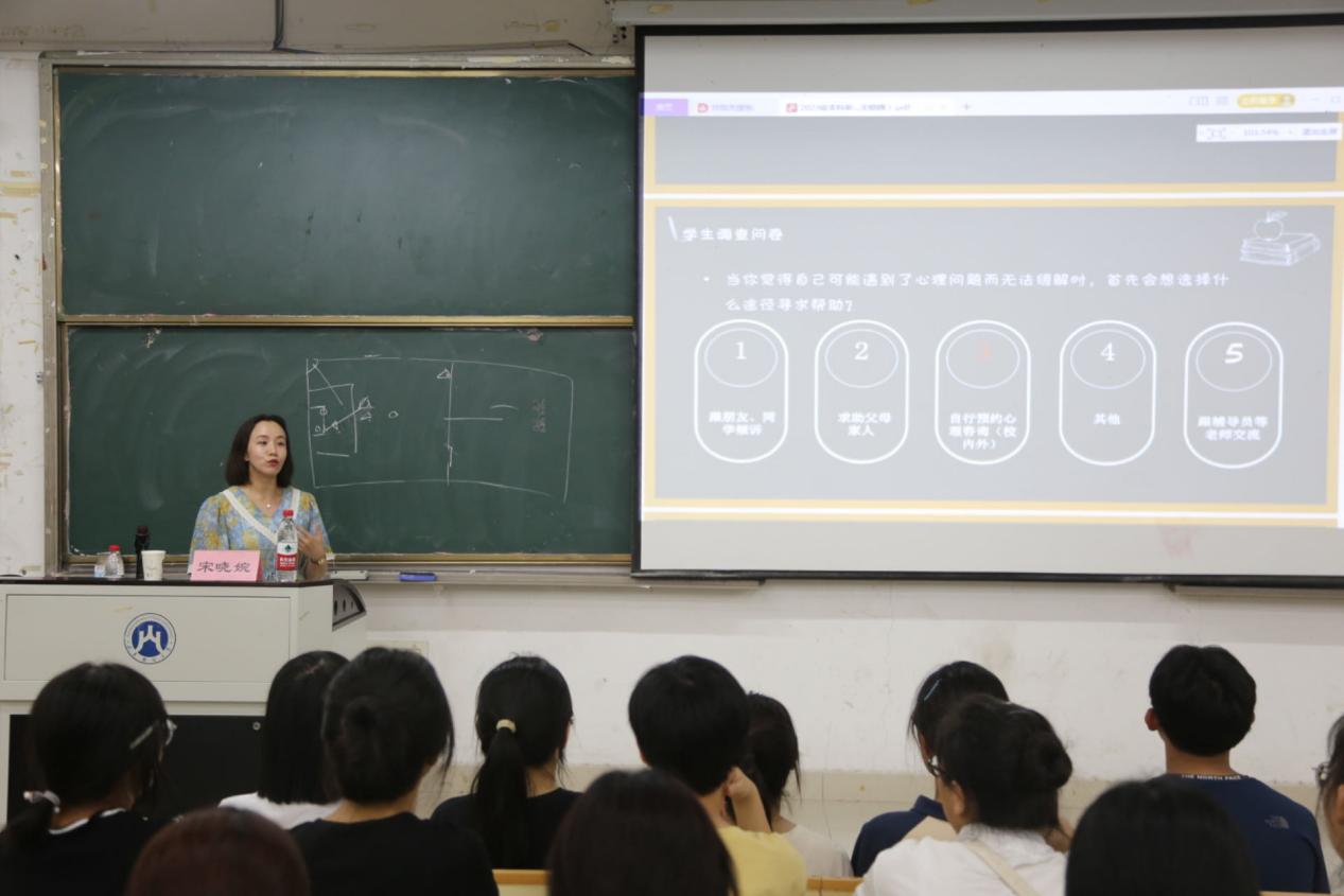 针对当前大学生常见的压力情景,宋晓婉分别从学习压力、人际关系、情绪管理等方面阐释如何用积极阳光的心态统领生命的状态,引导同学们以更加饱满的精神风貌迎接未来的大学生活。她以星座、MBTI等案例引出“巴纳姆效应”等心理学知识,帮助同学们进一步了解心理学,纠正对心理学的错误认知,培养自立、自强、自律的良好心理素质。