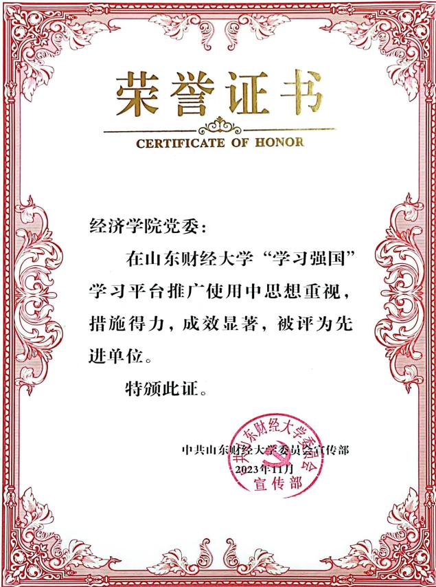 在本次表彰会上,经济学院党委再次荣获“学习强国”学习先进单位,宋鑫、张艺佳、苏芸琦、于凤芹、马祥振、冀兆鹏、滕睿7名同志荣获“学习强国”学习先进个人。“我与‘学习强国’的故事”征文比赛中,王元获教师组一等奖,周楠获学生组一等奖;郝海波、焦伟华、邵瑛瑛获教师组二等奖,文莎莎、吴佳俊、张艺佳获学生组二等奖;李珂涵、裴斐获教师组三等奖,景浩然、田聪、汪榆佳、赵雅轩获学生组三等奖。“红心向党队”的作品《青春心向党建功新时代》获山东省第四届高校思政短视频大赛校级选拔赛三等奖。经济学院2023级硕士研究生周楠作为征文比赛获奖者代表发言。