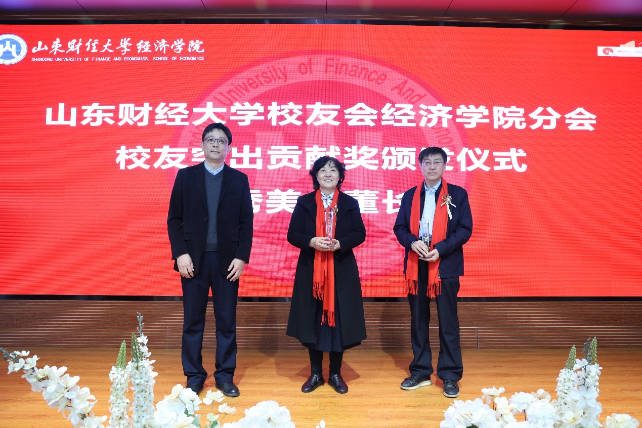 学院校友分会常务副会长、学院党委书记姜伟为学院老领导吕秀美、董长瑞颁发山东财经大学经济学院校友突出贡献奖。