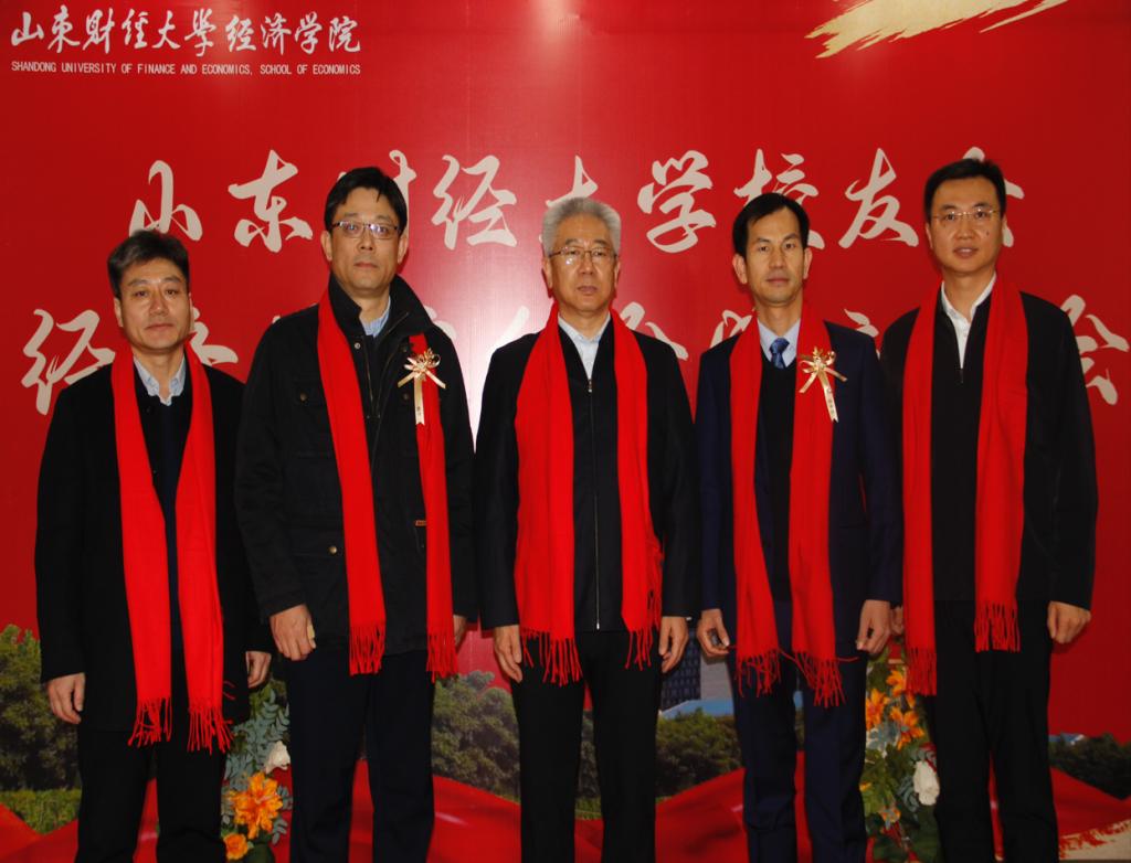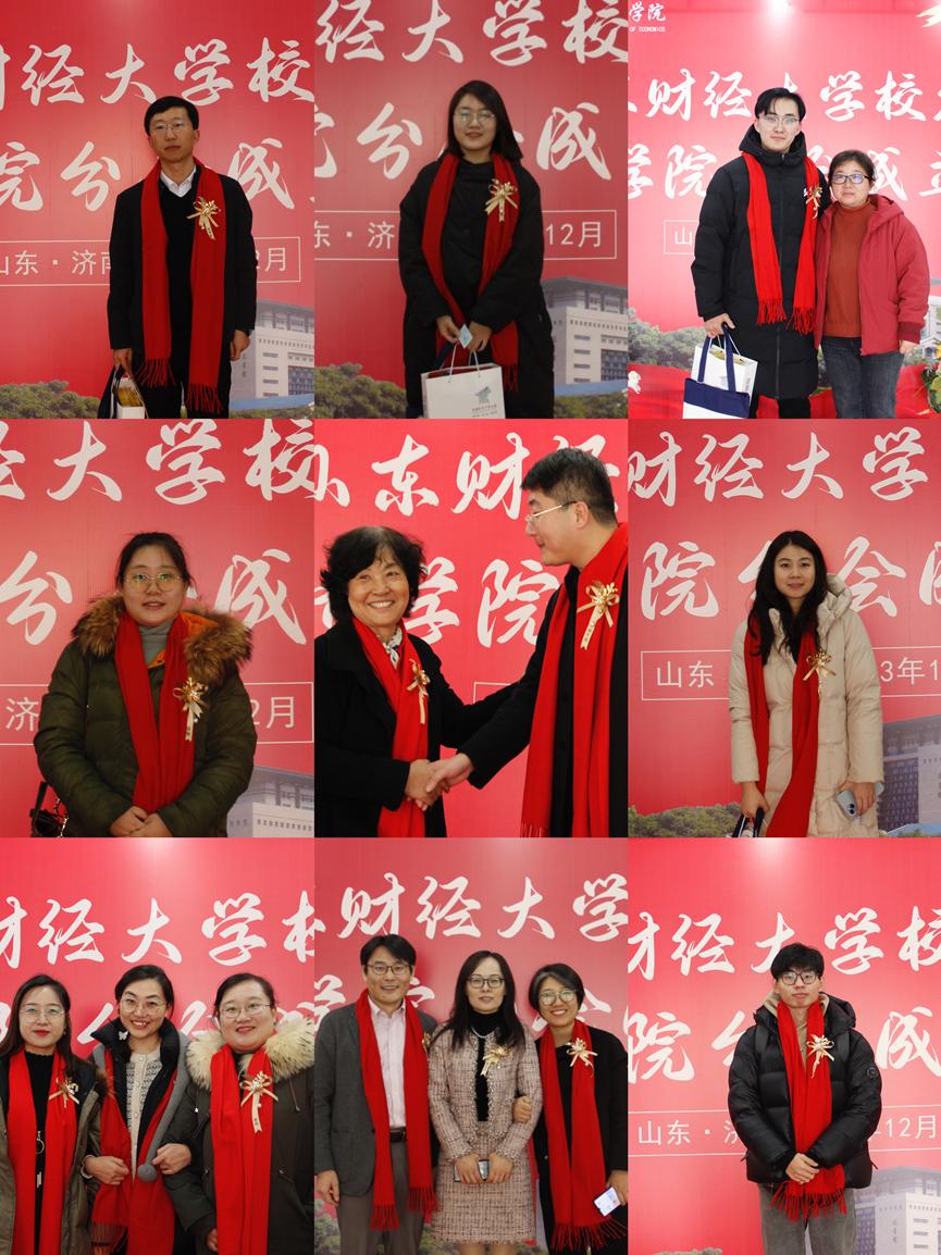 学校、学院领导老师与校友们系上温暖明艳的红围巾,在“山东财经大学校友会经济学院分会成立大会”展板前合影留念,共叙母校情谊。