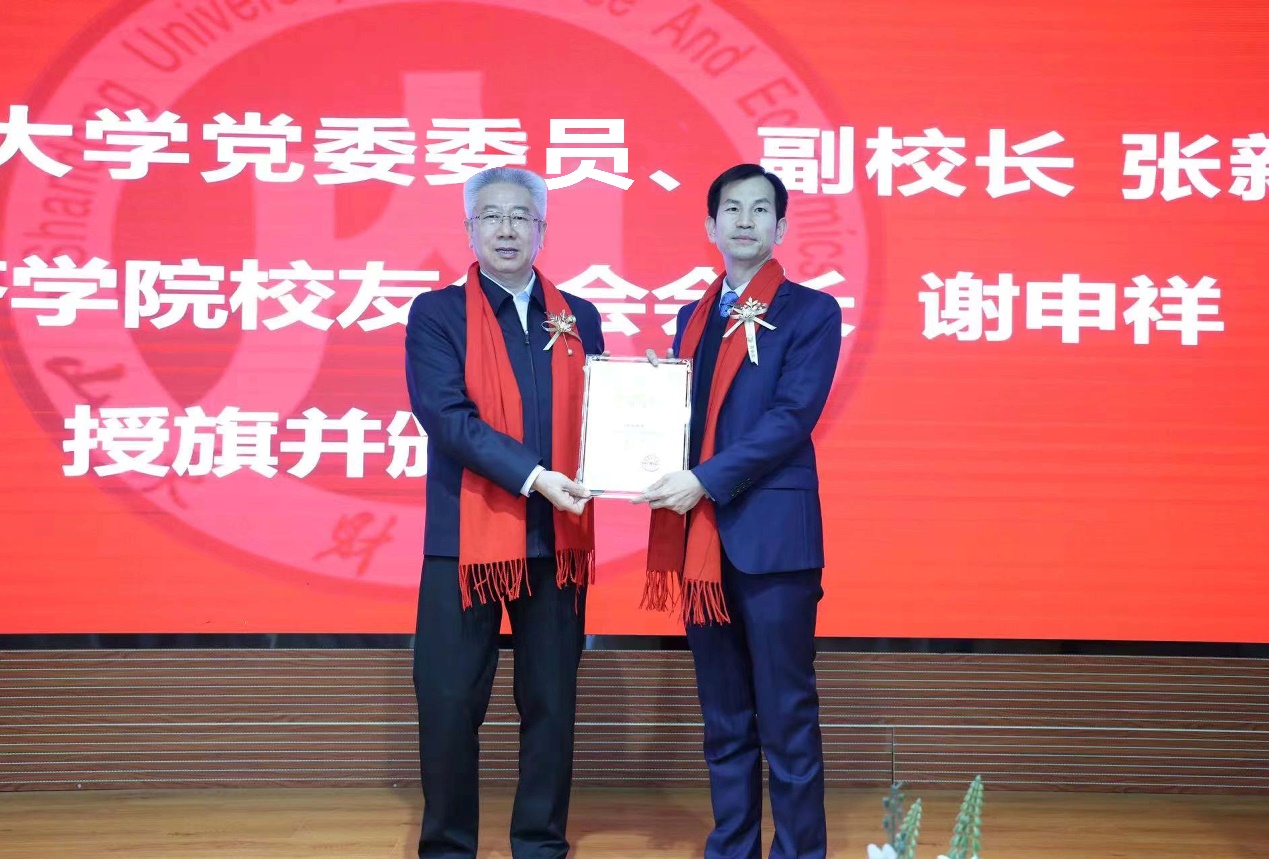 张新向校友会经济学院分会会长谢申祥授旗并颁发聘书。