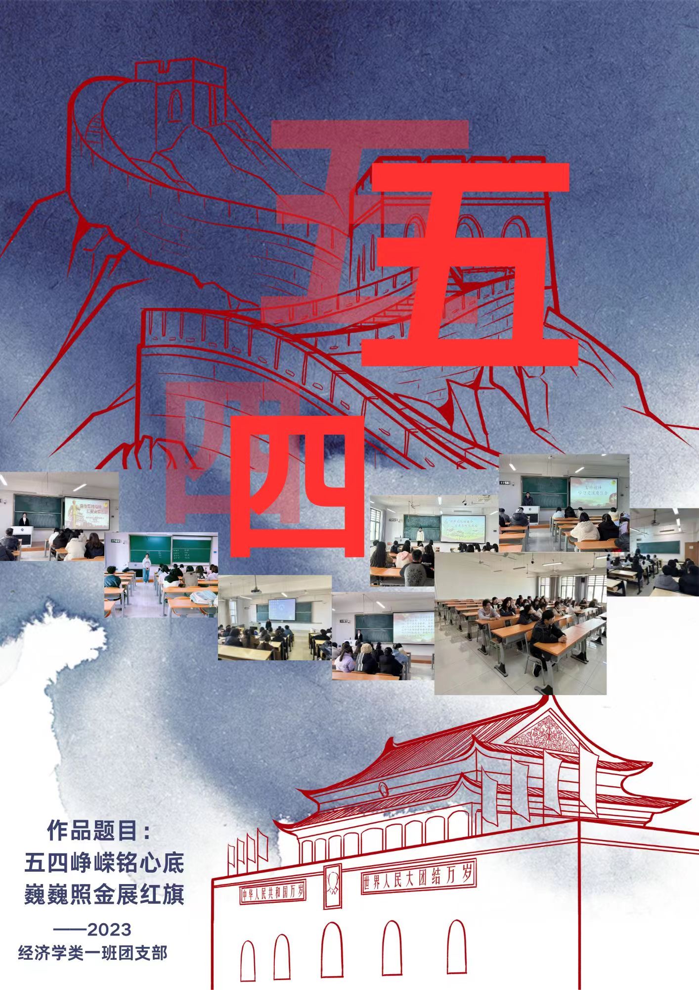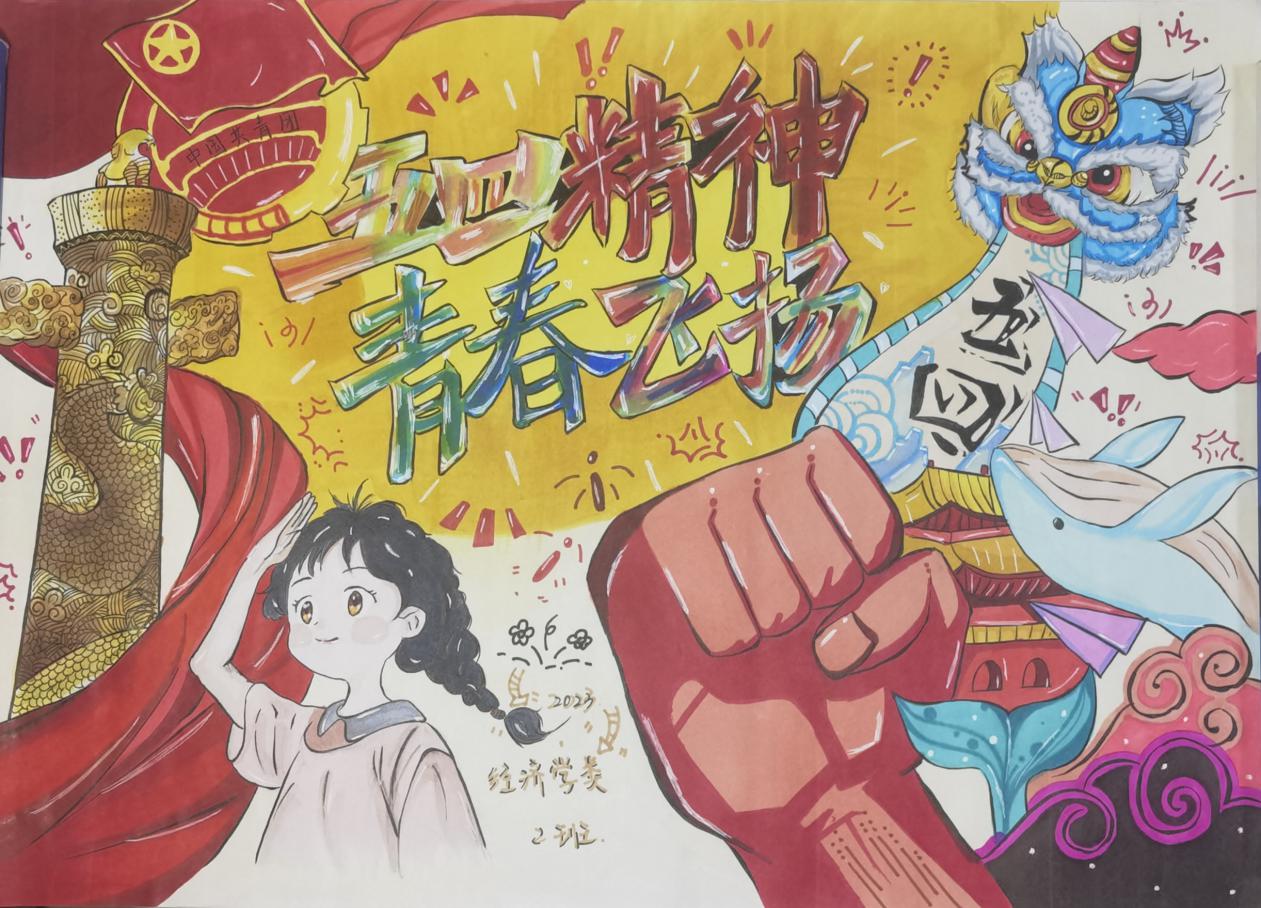 此次大赛面向经济学院2022级、2023级各团支部,历时一个多月,分宣传动员、征集作品、评审评奖三个阶段,各团支部围绕“承五四精神 展支部风采”主题,通过手绘或电子设计的形式,展示各团支部在思想引领、组织建设、服务青年等方面的亮点和特色。各参赛作品主题鲜明,内容丰富,形式多样。经济学专业2022级2班团支部作品《承五四精神,展支部风采》用凝练且有条理的文字介绍团支部建设总体情况,显示团支部组织建设成绩和特色;2023级经济学类1班团支部作品《五四峥嵘铭心底,巍巍照金展红旗》以水墨铺底,将团支部开展主题团日的照片融入巍巍长城图案;2023级经济学类2班团支部作品《五四精神,青春飞扬》色彩鲜艳,画工精妙,闪耀的团徽、飞扬的红旗、舞动的雄狮跃然纸上,生动地诠释了青年弘扬五四精神的坚定信念;资源与环境经济学专业2022级创新实验班团支部作品《我们在行动》更是从组织建设和思想引领两个方面展现了团支部对五四精神的生动实践。