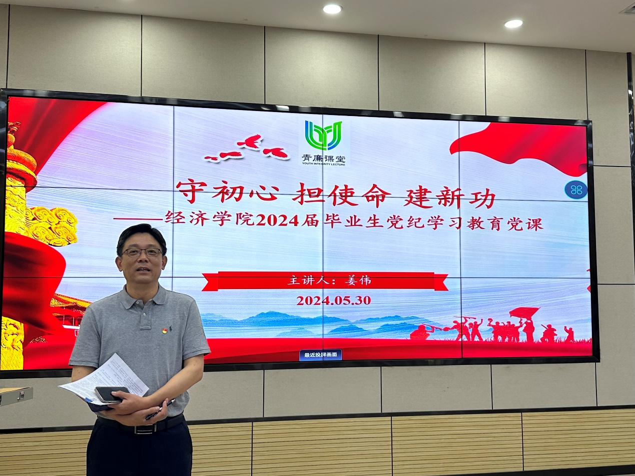 (通讯员:代东俐)为深入开展党纪学习教育,进一步增强毕业生党员的纪律规矩和廉洁意识,2024年5月30日下午,经济学院党委书记姜伟在舜耕校区讲授“守初心担使命建新功”党纪学习教育专题党课。经济学院党委副书记陈静、团委书记付雯、党委专职组织员王琦以及2024届毕业生全体党员参加本次活动。