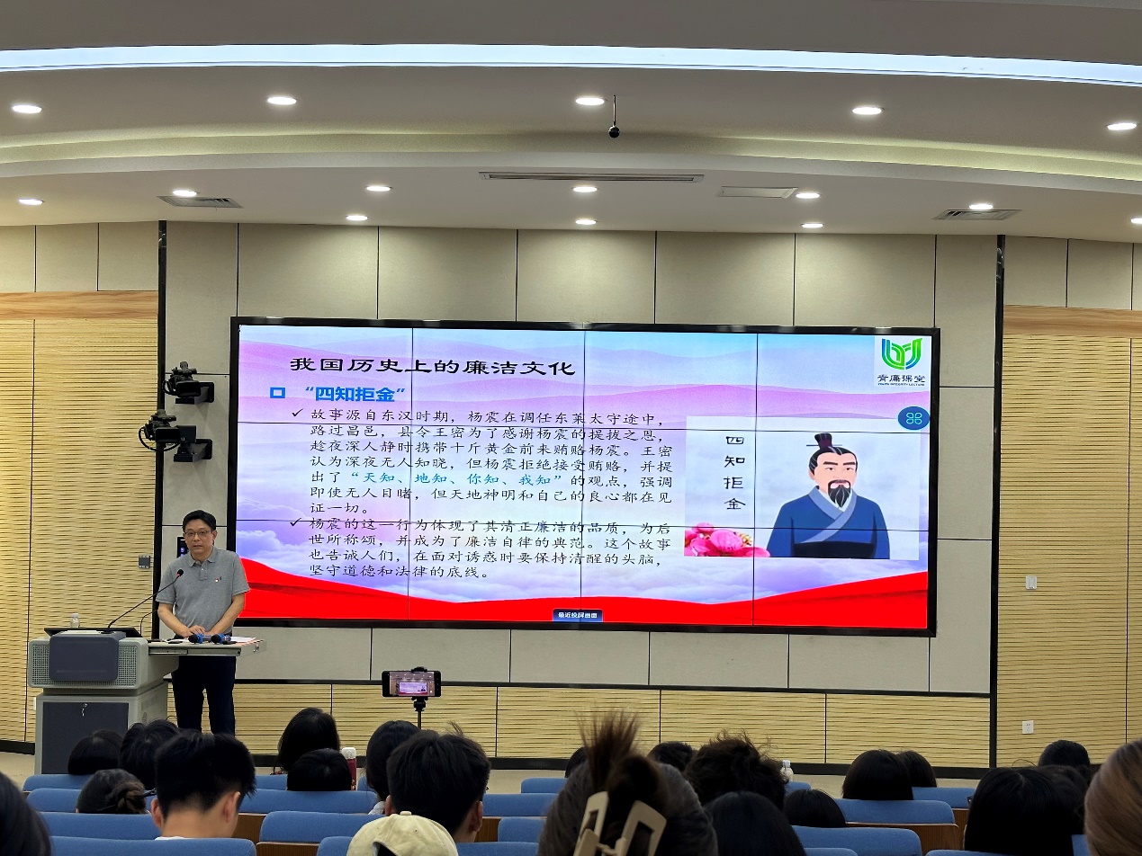 姜伟围绕党的廉洁文化建设、《中国共产党纪律处分条例》、年轻干部警示案例展开深入讲解。他以新民主主义革命以来党的各阶段廉洁建设为切入点,阐明了新时代不断夯实清正廉洁思想根基的必要性。在介绍《条例》发展历史脉络的基础上,强调了《条例》修订的重要意义,并深刻解读了《条例》修订对党的纪律建设、制度建设和事业发展的服务作用。最后以典型案例生动阐明了廉洁自律的实践要求,警示同学们在今后的工作和生活中要真正做到明规矩、知敬畏、存戒惧、守底线。