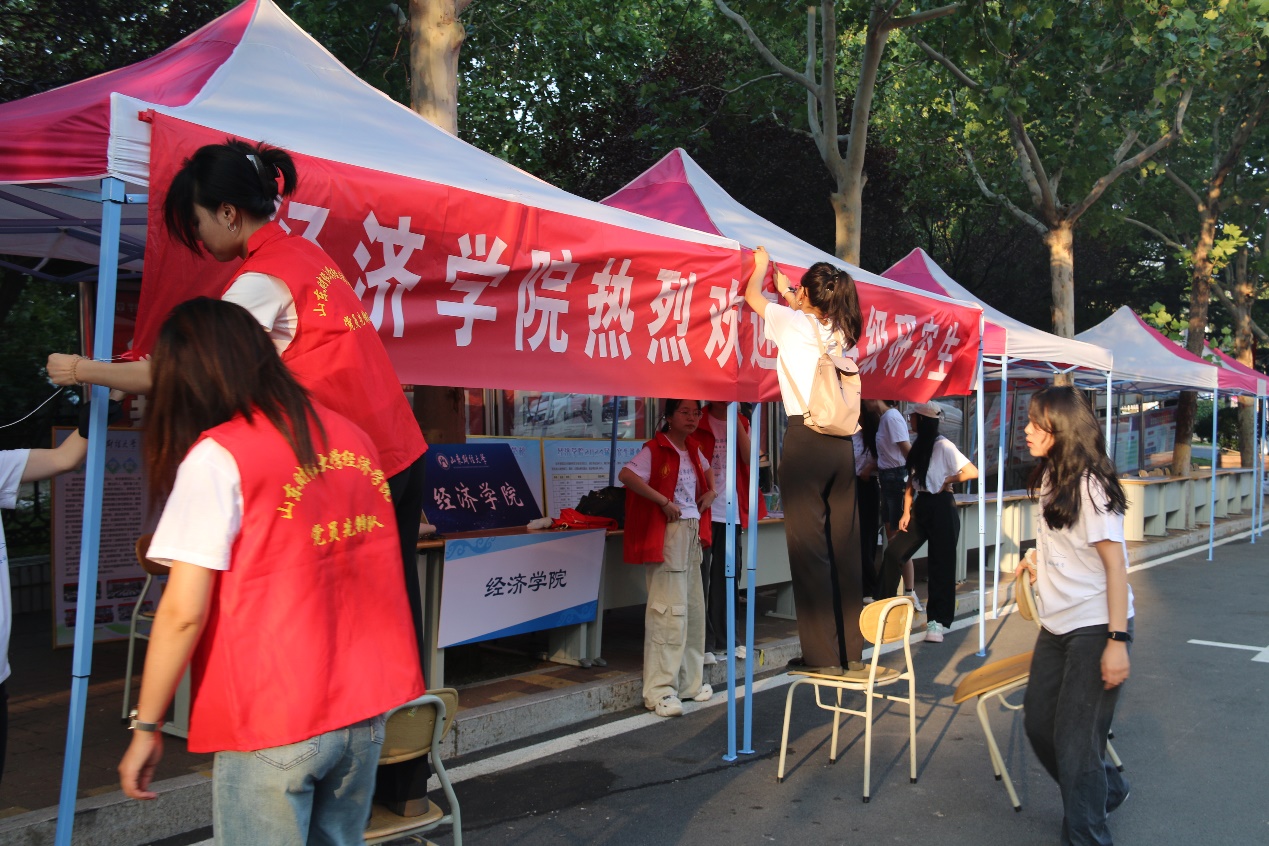 晨光熹微,学院研究生会各部门积极筹备,搭帐篷、拉横幅、搬桌椅,井然有序迎接新同学的到来。
