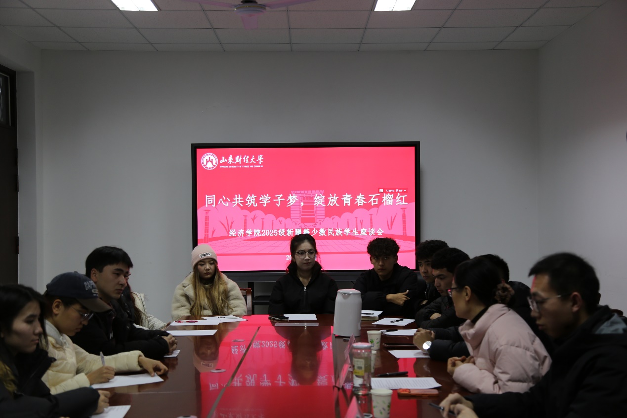 为铸牢中华民族共同体意识,进一步凝聚民族同心力量,精准回应少数民族学生学习生活诉求,12月2日晚,经济学院在章丘校区7213会议室举办2025级新疆籍少数民族学生座谈会。经济学院党委副书记李冰封,辅导员张仰威、管光栋,2024级新疆籍少数民族学生代表和2025级全体新疆籍少数民族学生参加此次座谈。会议由张仰威主持。