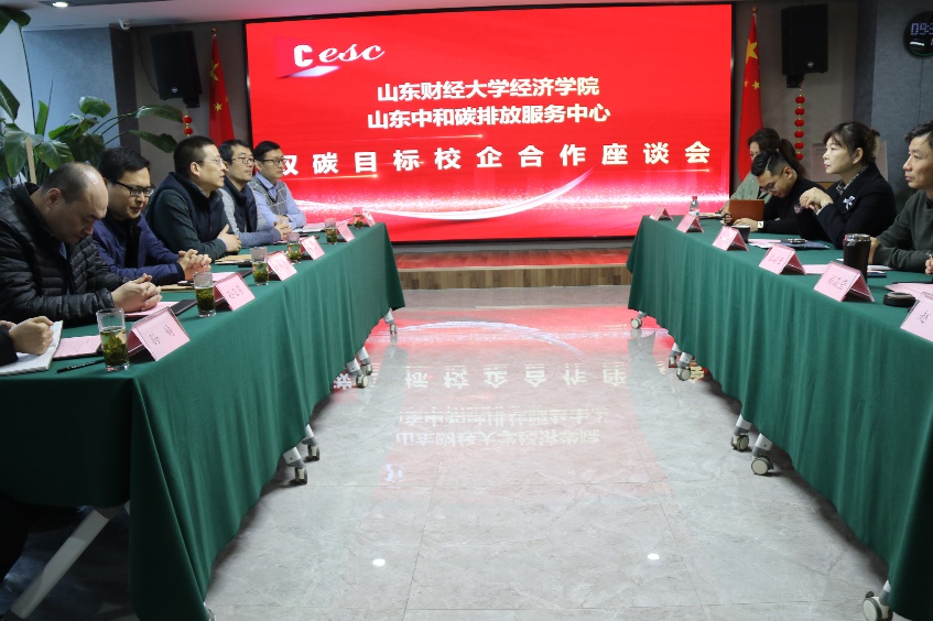 座谈会上,山东中和碳排放服务中心总经理郑静介绍了2023年中和碳服务中心的重点工作及发展战略规划,提出相关工作的人才需求情况;刘华军教授详细询问了中和碳服务中心相关工作进展,提出要抓住机遇,迅速响应,将学院教学育人和企业用人需求相结合,做实做细校企合作;张明志副院长介绍了学院双碳实验班的教学和培养情况,在共商人才需求、共建学科专业、共管人才培养等方面,提出了加强校企深度合作的方案;陈明华教授、孙亚男教授、赵传松副主任、孙婷副主任分别对校企合作中的资源共享、课程设置、碳交易模拟实操系统共建等多个方面进行了深入讨论与交流。