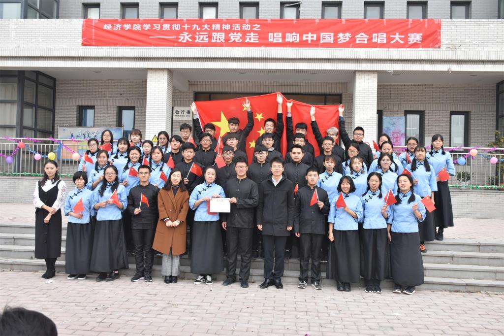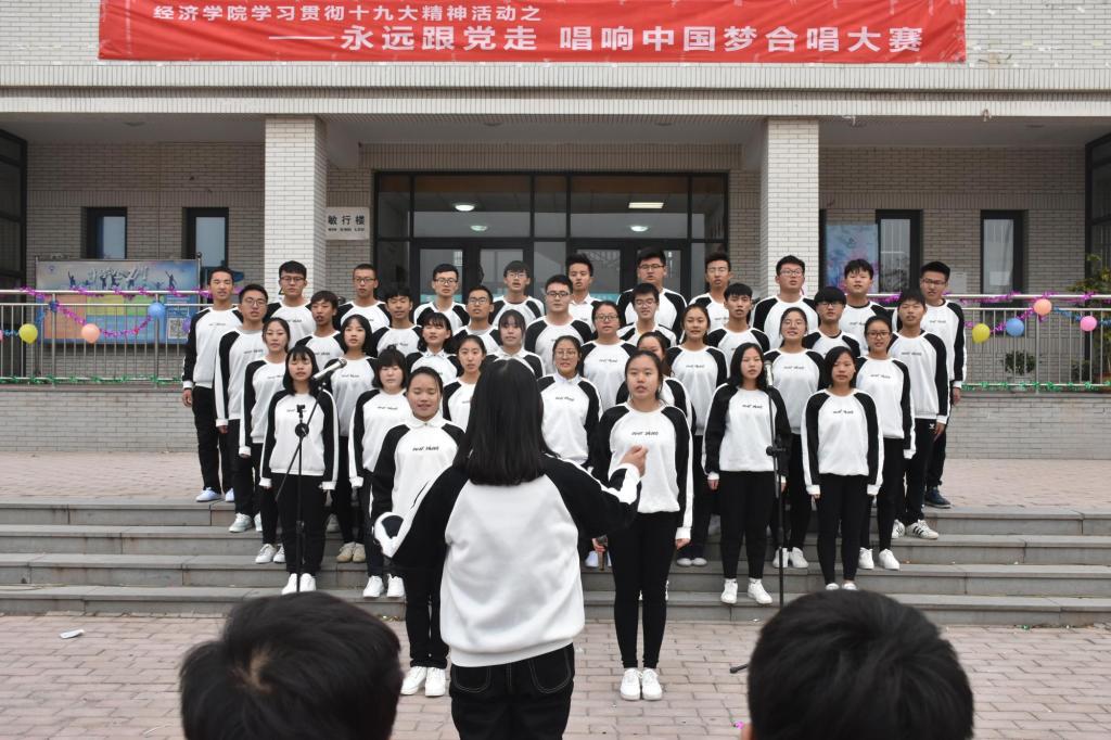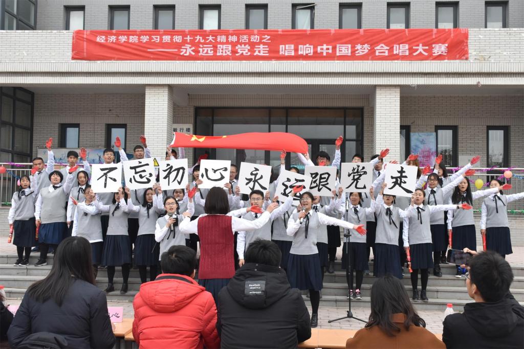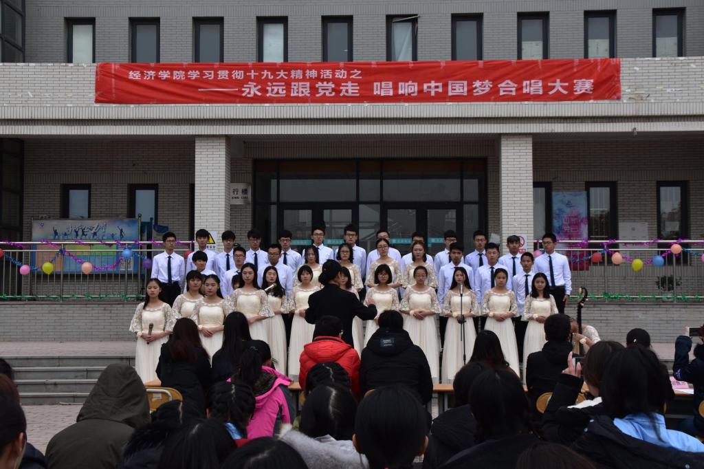 (通讯员:白战杰 杨晓雯)为深入学习贯彻十九大精神,激发同学们爱党爱国情怀,展现经济学院学子良好精神风貌和艺术素养,营造格调高雅、健康向上的校园文化氛围,11月16日下午14:00,经济学院于圣井校区敏行楼前举办“永远跟党走,唱响中国梦”合唱大赛。此活动系我院学习贯彻十九大精神系列活动之一。经济学院辅导员付雯、朱海林老师出席,2017级全体学生到场参加。