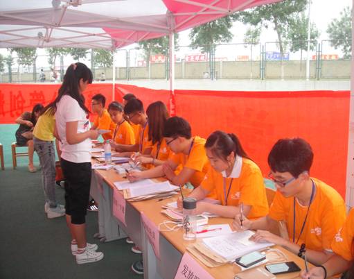 经济学院迎新工作人员统一着橘黄色上衣,用细心贴心的服务力求让家长放心,让新生舒心。为保证我院新生报到的顺利进行,我院迎新工作特设宣传组、宿舍安排组、物品准备组、资料准备组、证件办理组、赞助组、场地安排组、引导员组、家长休息区、报到组、宣传材料发放组、引导新生入住组、秩序维持组、志愿者培训组、接站组、学生辅导员组、值班组、卫生组、通讯组、考评组共20个工作小组,各迎新工作人员以主人翁的姿态,热忱周到、谦和有礼、耐心细致地投入工作。新生报到组以“一站式”服务,快捷高效地帮助新生完成收取录取通知书、准考证,验证缴费情况、发放一卡通、卧具领取单、宿舍钥匙、宣传材料等手续;家长休息区的工作人员为新生安置行李,为家长倒水,解答家长提出的关于我院专业设置、学科建设以及创新实验班等问题;秩序维持组有序维持现场秩序,保证迎新报到工作高效进行。