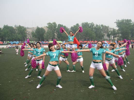 迎着和煦的春风,带着自信的微笑,我院啦啦操队员们伴着动感十足的节奏走上绿草坪,以充满爵士味的舞蹈为运动员加油助威。经过了十多天紧张刻苦的排练,啦啦操队员们以最曼妙的舞姿,最饱满的精神,最优雅的形象出现在运动会赛场上。她们扎着长长的马尾,身着孔雀绿的上衣和白色短裤,服装简练,队列整齐而富有变化,时而散开,时而聚拢,精确到位的伸展腾挪将运动的活力与美感展露无遗。