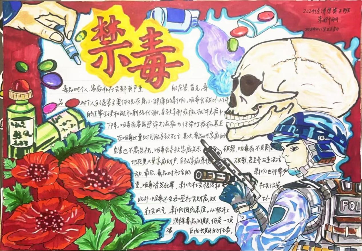王雅婷《远离毒品》在手抄报中心用艺术字“远离毒品”点明主题,周围绘制骷髅、注射器等象征毒品的图案,以“毒”、“财”、“家”、“命”四个字,分别代表毒品对个人、家庭和社会的破坏;张展铭《健康人生,绿色无毒》采用行书字体,笔画流畅,结构稳健,书法的自然通畅与作品的主题相得益彰,传达出作者积极向上的生活态度和远离毒品的坚定决心;苏义斐《珍爱生命,远离毒品》运用传统的篆书字体,以其独特的艺术风格传达出珍爱生命、远离毒品的深刻内涵。律屹峰《健康之路,绿色无毒行》以议论文的形式,强调在青春时期这一重要人生阶段要远离毒品,保持健康生活方式的重要性和必要性,既是对青年的鼓励,也是对社会的希冀;刘欣宇《追光》选取散文文体,文风隽永,运用大量的对比和双生花的隐喻,揭示毒品的双重危害,以开满虞美人的山坡作结,呼吁人们共创无毒未来。