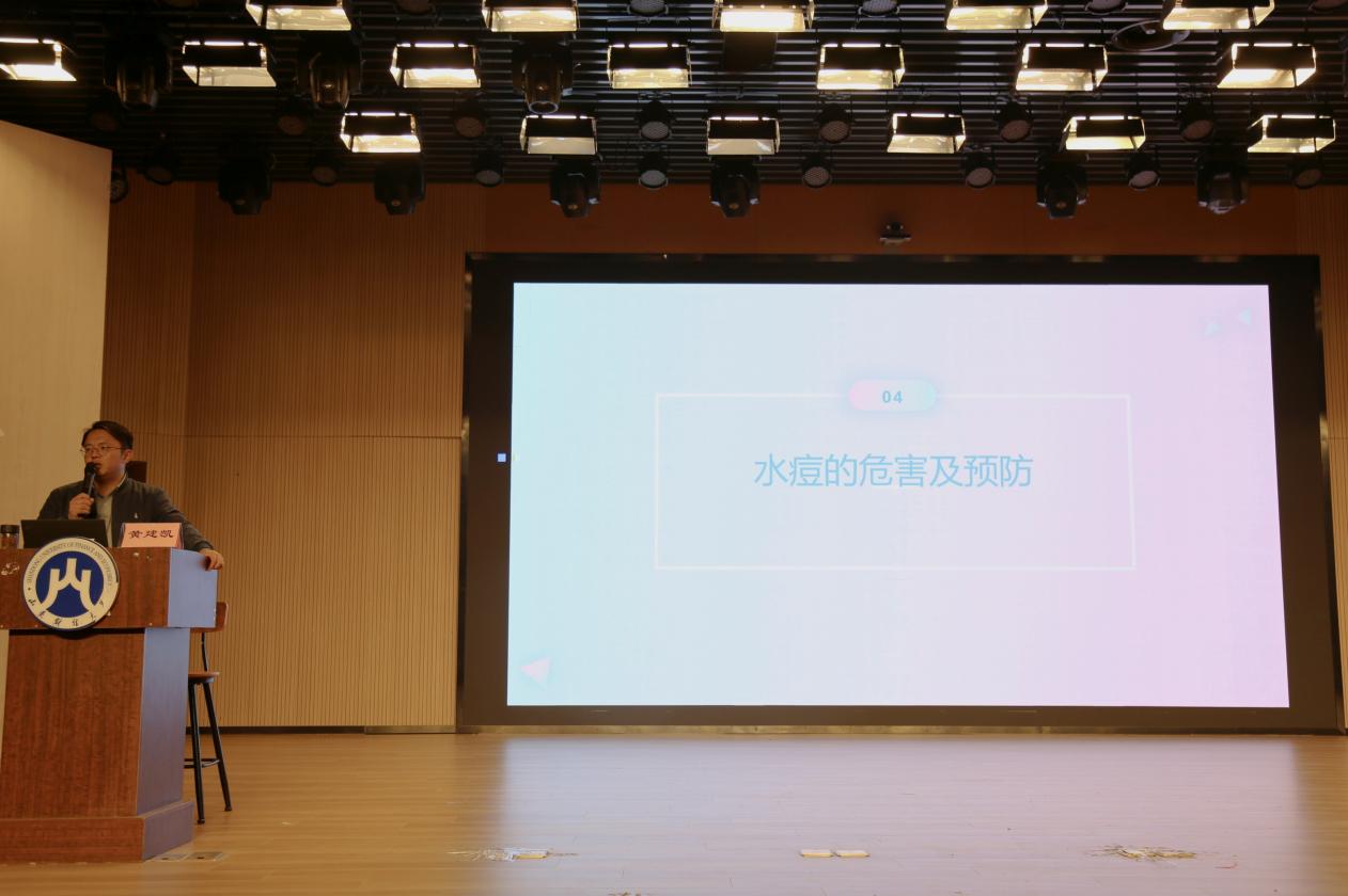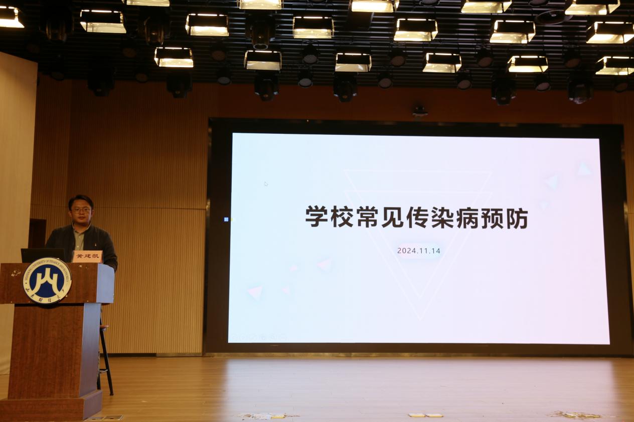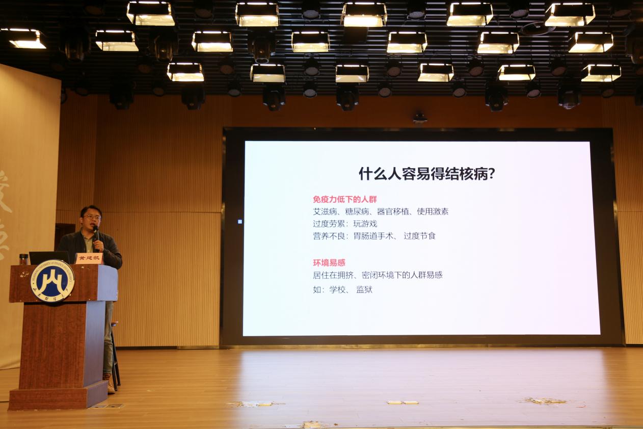 黄建凯从传染病的含义、传播途径、易发场所和易感人群四个方面向同学们展开详细介绍,并着重介绍乙肝和结核病两种传染病的危害及预防措施。他点明乙肝的主要传播途径包括血液传播、母婴垂直传播、性传播、医源性传播四种,指出由于集体生活、日后就业影响等多重因素,在校大学生必须尽早预防乙肝。介绍结核病时,黄建凯从结核菌的特点出发,提醒同学们在秋冬季节要勤洗手、勤通风,注意个人卫生,培养健康的生活习惯,从根源上阻断结核病的传播。对于水痘、流行性感冒等其他传染病,他提出同学们应当加强体育锻炼,提升身体素质,从而有效抵御传染病的侵袭。