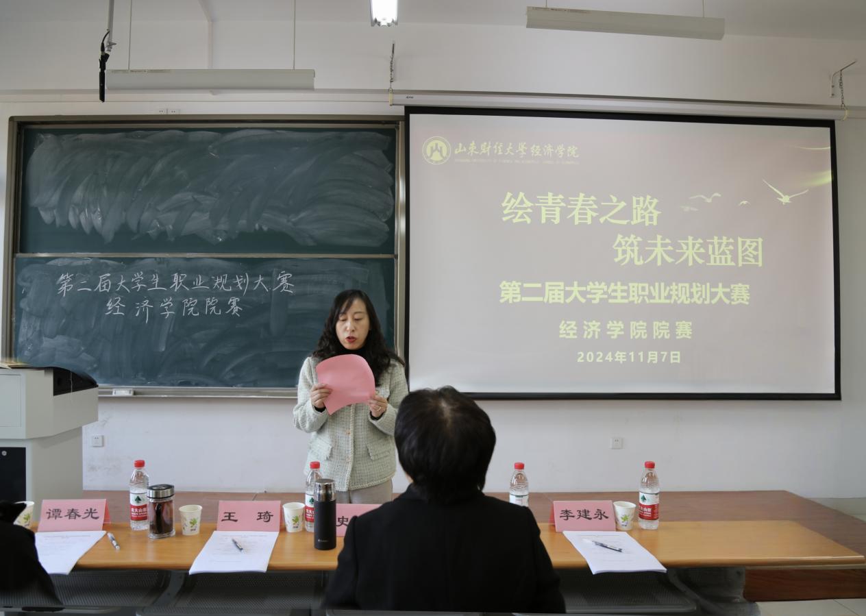 (通讯员:戴悦偲 范嘉颖)为加强我院学生生涯教育和就业指导,帮助学生增强职业规划意识,引导学生树立正确的成长成才观和择业就业观,提高学生就业能力和就业竞争力,11月7日下午,经济学院在圣井校区7号教学楼举办“绘青春之路,筑未来蓝图”第二届大学生职业规划大赛。山东当代教育评估中心副主任、教育部宏志助航就业培训授课教师史萌,经济学院党委专职组织员王琦,辅导员李建永、谭春光、张仰威出席比赛并担任评委。大赛由经济学院团委书记付雯主持。