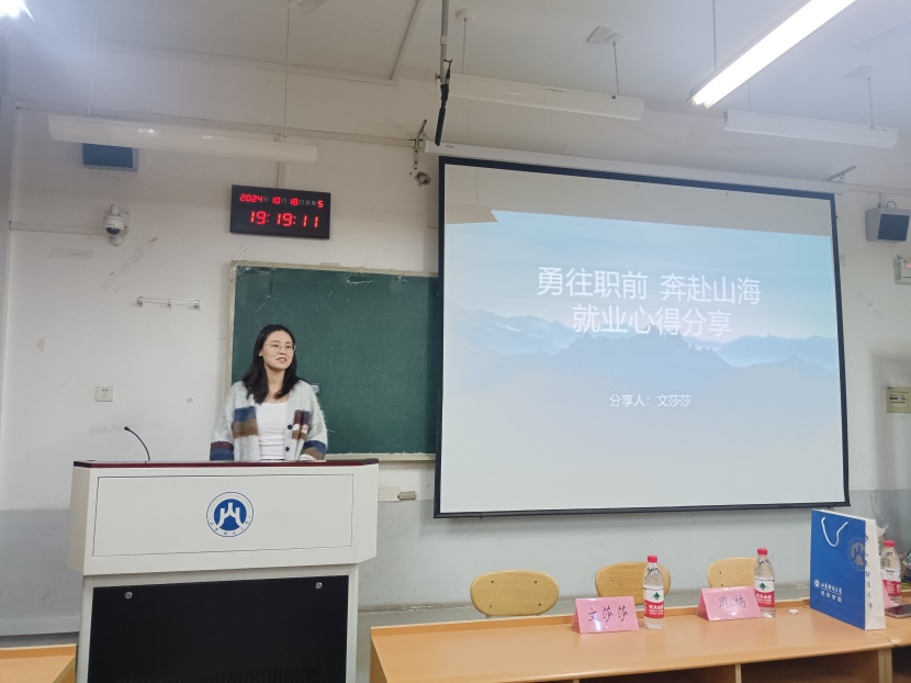 文莎莎以“勇往职前 奔赴山海”为主题,介绍了备考公务员与秋招的经历与心得。她讲解了考公岗位信息如何收集、考公岗位如何选择等,认为备考中需要打牢知识基础,厚积才能薄发;她认为同学们应当通过企业官方网站、公众号等多种路径收集岗位信息,强调了拓展求职信息来源的重要性。