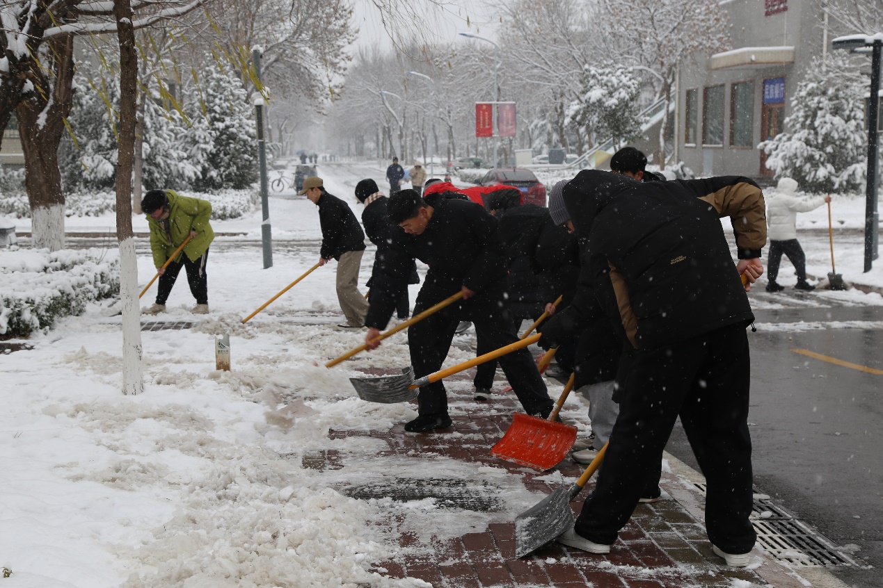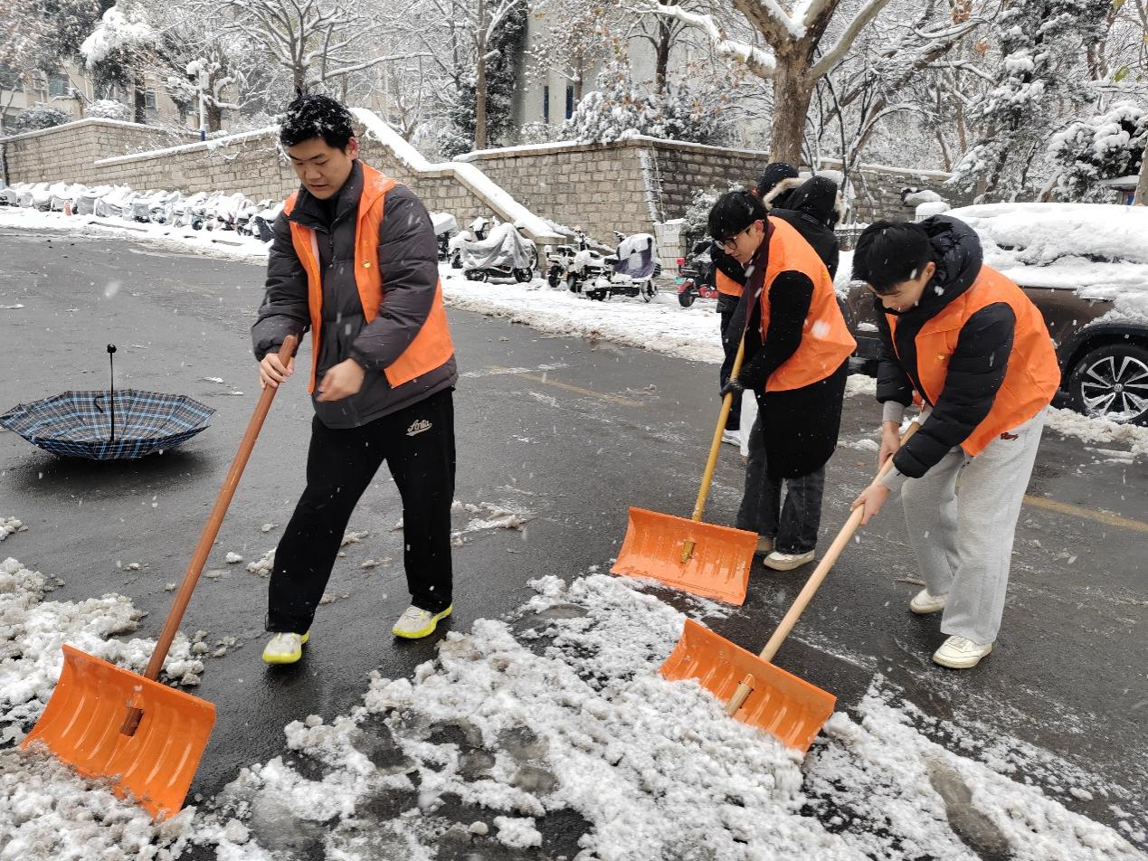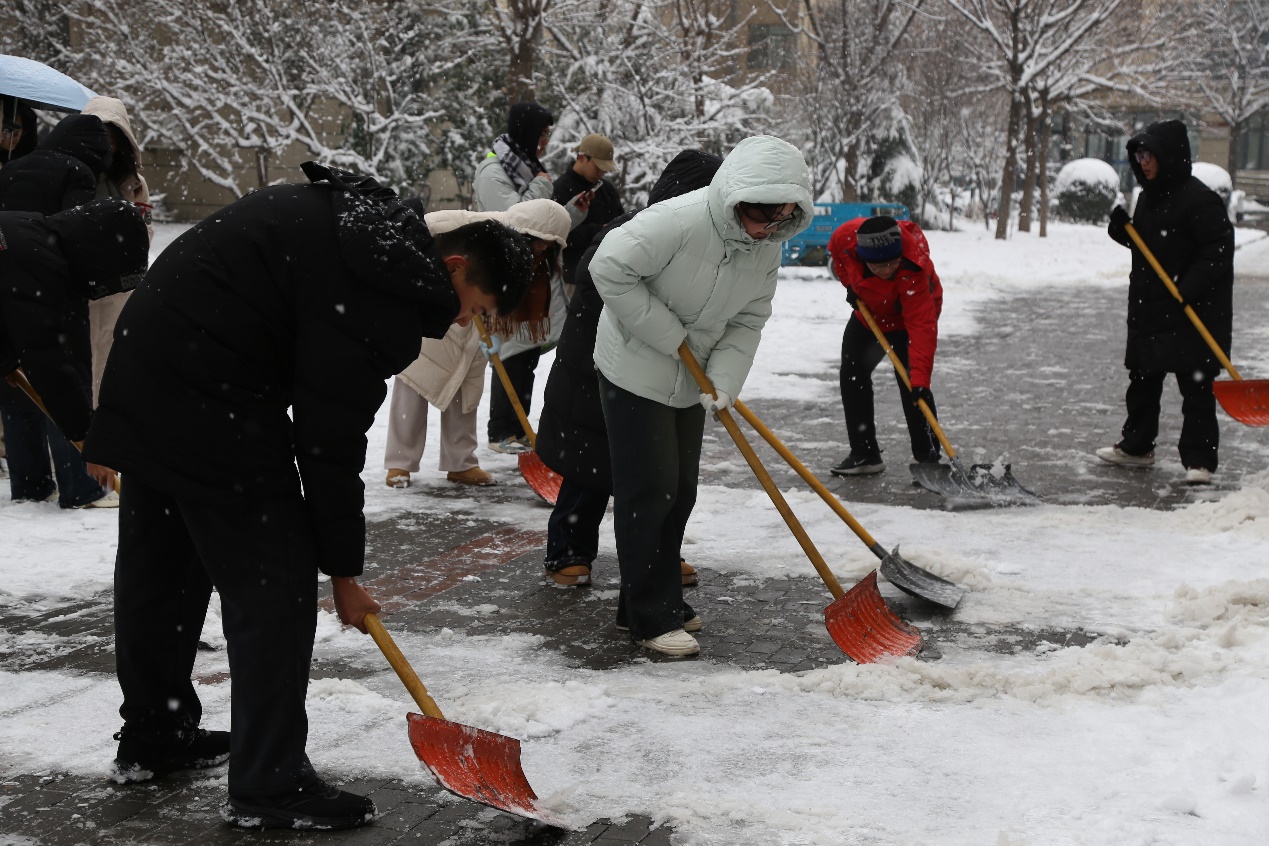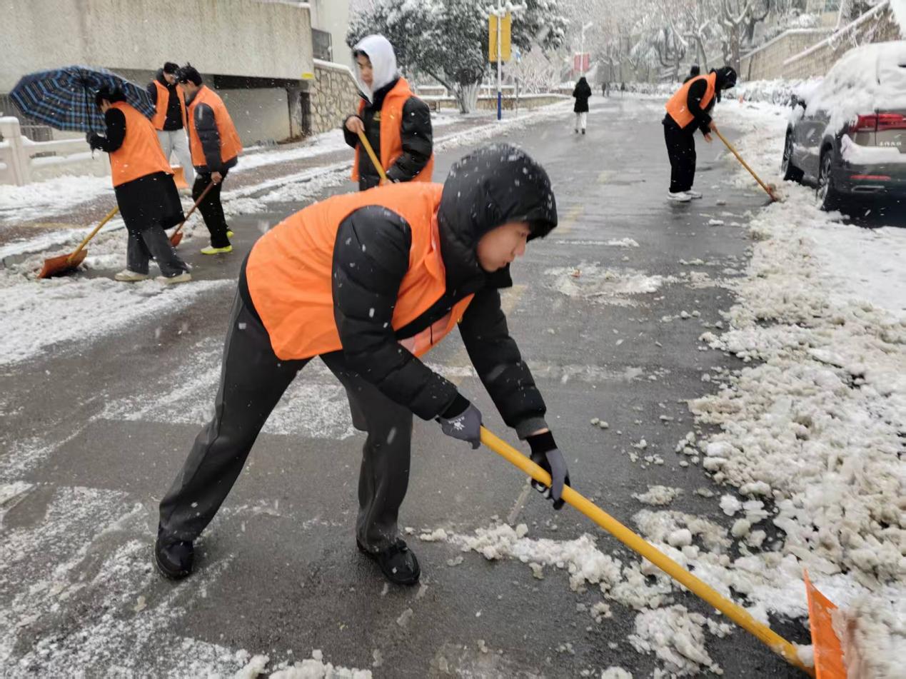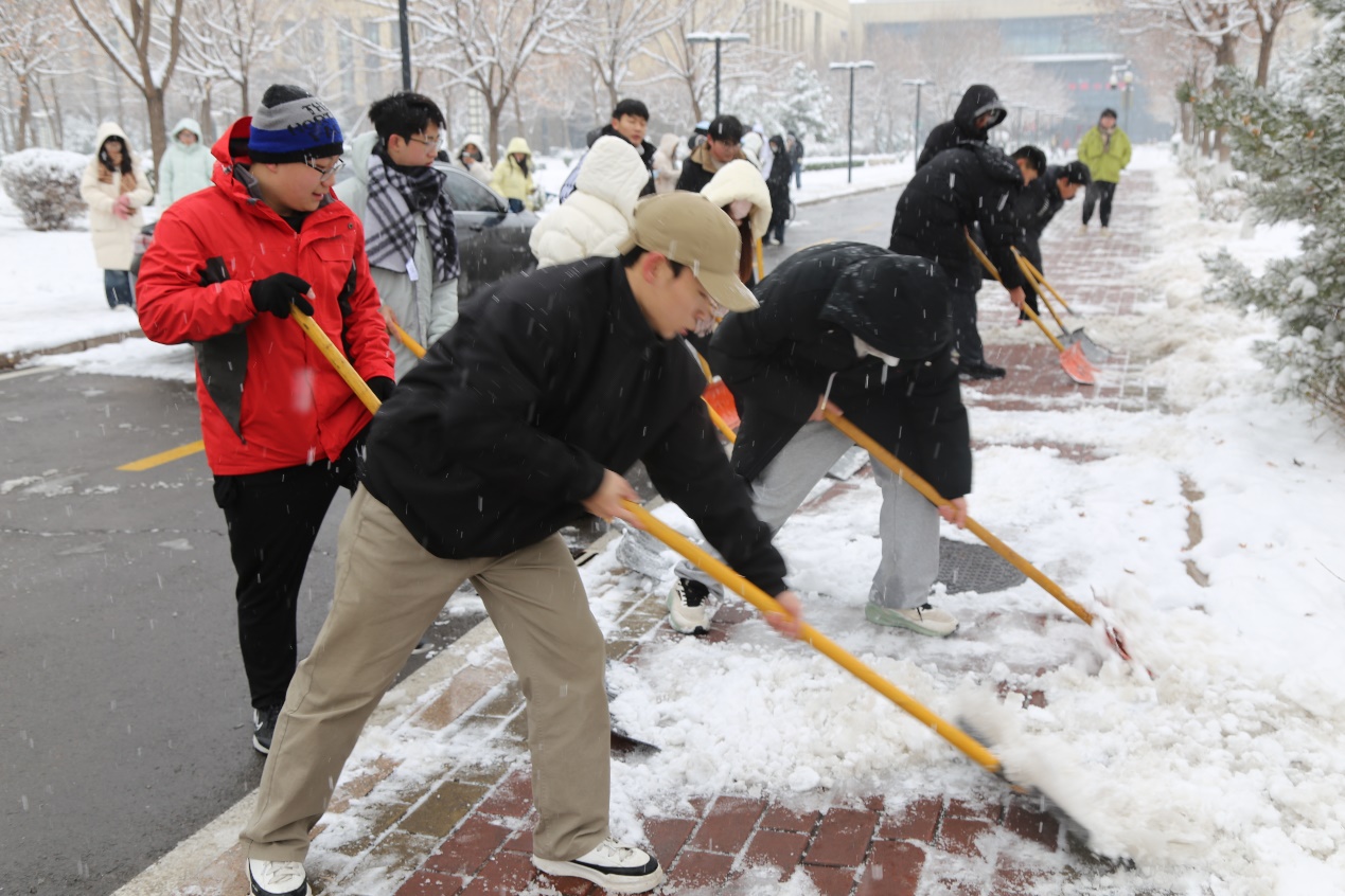 户外气温骤降,严寒丝毫未消弭全体成员的奉献热情,同学们主动响应、迅速行动,全力开展校园积雪清理劳动。大家手持各类清雪器具,齐心协力、并肩作战,对章丘校区七教西侧、九教北侧、七宿北侧、八宿北侧区域,舜耕校区行政楼广场前至西大门外区域的积雪进行彻底地清扫,全力消除出行安全隐患。清雪现场,同学们分工明确、协作无间,尽显团结奋进之风,以实干诠释校园情怀与责任担当。