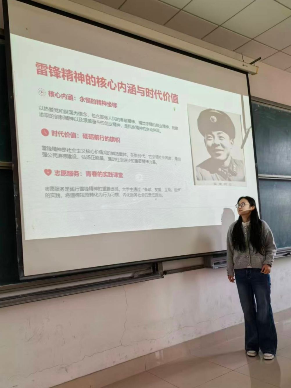 活动伊始,主持人依托主题PPT开展集中学习,系统阐释雷锋精神的核心内涵与时代价值:从热爱党和祖国的信念根基,到服务人民的奉献精神、精益求精的敬业精神,再到锐意进取的创新精神与艰苦奋斗的创业精神,清晰勾勒出雷锋精神作为民族精神生动体现的核心要义。同时,结合志愿服务是践行雷锋精神重要途径的理念,引导同学们认识到“奉献、友爱、互助、进步”的志愿精神与雷锋精神一脉相承,是新时代青年践行社会责任的重要载体。