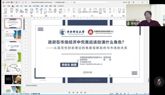 本次报告的主题是“政府在市场经济中究竟应该扮演什么角色?——从规范性财政理论的角度观察政府与市场的关系”。报告分析了为什么必须研究政府在市场经济中的角色问题,政府是否正在改变其在市场中的角色,如何理解政府在市场中的主体地位,以及政府在市场中的双重角色与两种指标。研究得出四个结论:一是政府决策与服务的技术基础在变化,二是市场主体(政府与非政府)之间的关系在变化,三是国家范围内政府之间的关系在变化,四是公民的社会地位在变化。李俊生教授还就国家——国家权力机构——政府的涵义进行延申讨论。