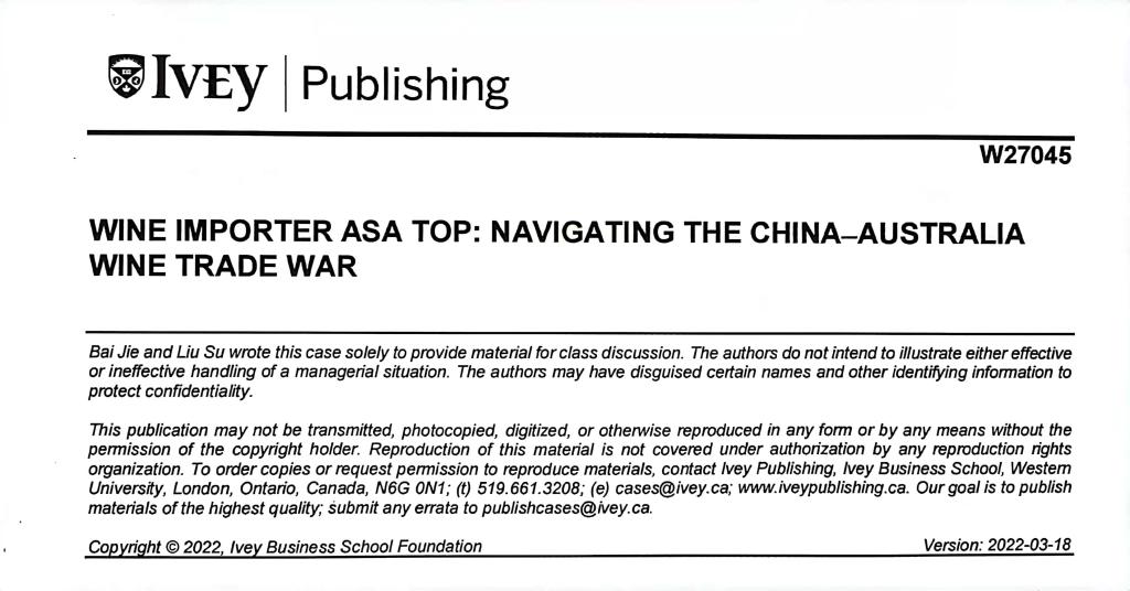 白洁、刘素两位老师经过一年多的跟踪调研,撰写的案例“Wine Importer Asa Top: Navigating the China-Australia Wine Trade War”(可译为:身处中澳贸易战旋涡中的中国葡萄酒进口商阿萨之巅该何去何从?)发表于国际知名的商业案例库Ivey Publishing。