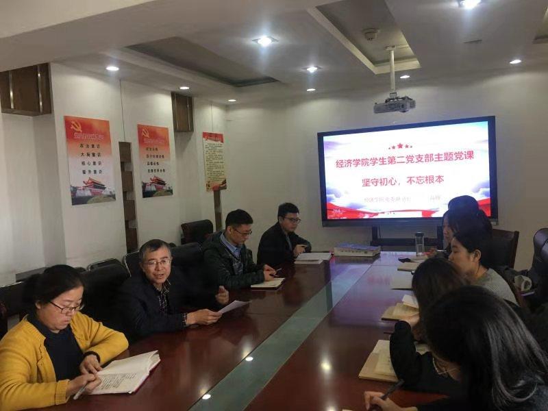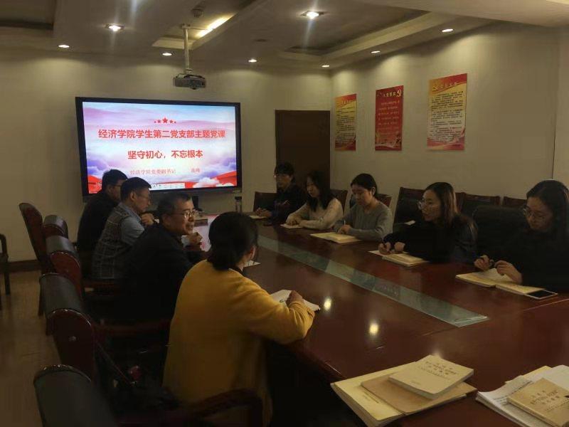 2019年10月25日中午,院党委副书记高峰在办公楼1208会议室为经济学院学生第二党支部上了一堂题为“坚守初心,不忘根本”的党课,学生第二党支部全体党员聆听了此次党课。党课由学生第二党支部书记裴斐主持。