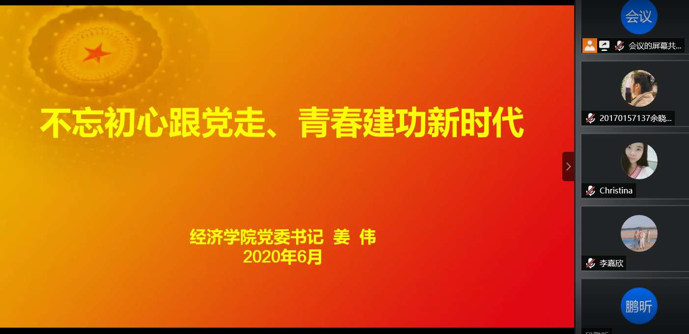 2020年6月24日下午,经济学院党委书记姜伟以“不忘初心跟党走,青春建功新时代”作主题为学生第五党支部上了一堂深刻的党课。会议由党支部书记李冰封主持,学生第五党支部28名党员参加。
