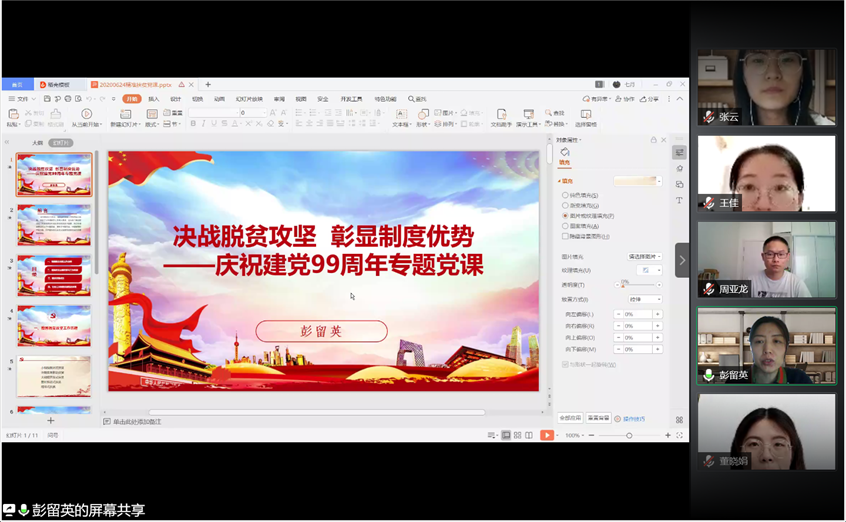 (通讯员:付雯孙俏俏)为热烈庆祝中国共产党建党99周年,贯彻落实全国全省基层党建工作重点任务推进会精神,根据中组部“党课开讲啦”活动安排和省委组织部、省委教育工委有关通知要求,按照校党委组织部“我来讲党课”活动部署,6月24日上午,经济学院学生第三党支部利用腾讯会议平台开展“决战脱贫攻坚,彰显制度优势”专题党课。本次党课由经济学院副院长彭留英教授主讲,经济学院学生第三党支部全体党员参加,党课由学生第三党支部书记付雯主持。