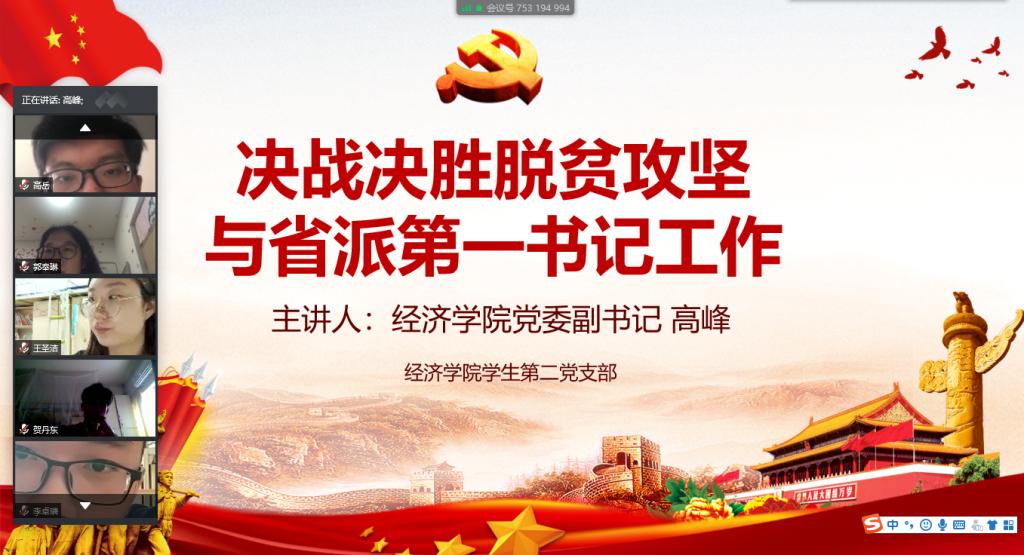 2020年6月28日下午,经济学院党委副书记高峰为经济学院学生第二党支部上了一堂主题为“决战决胜脱贫攻坚与省派第一书记工作”的党课,学生第二党支部全体党员聆听了此次党课,党课由学生第二党支部书记裴斐主持。