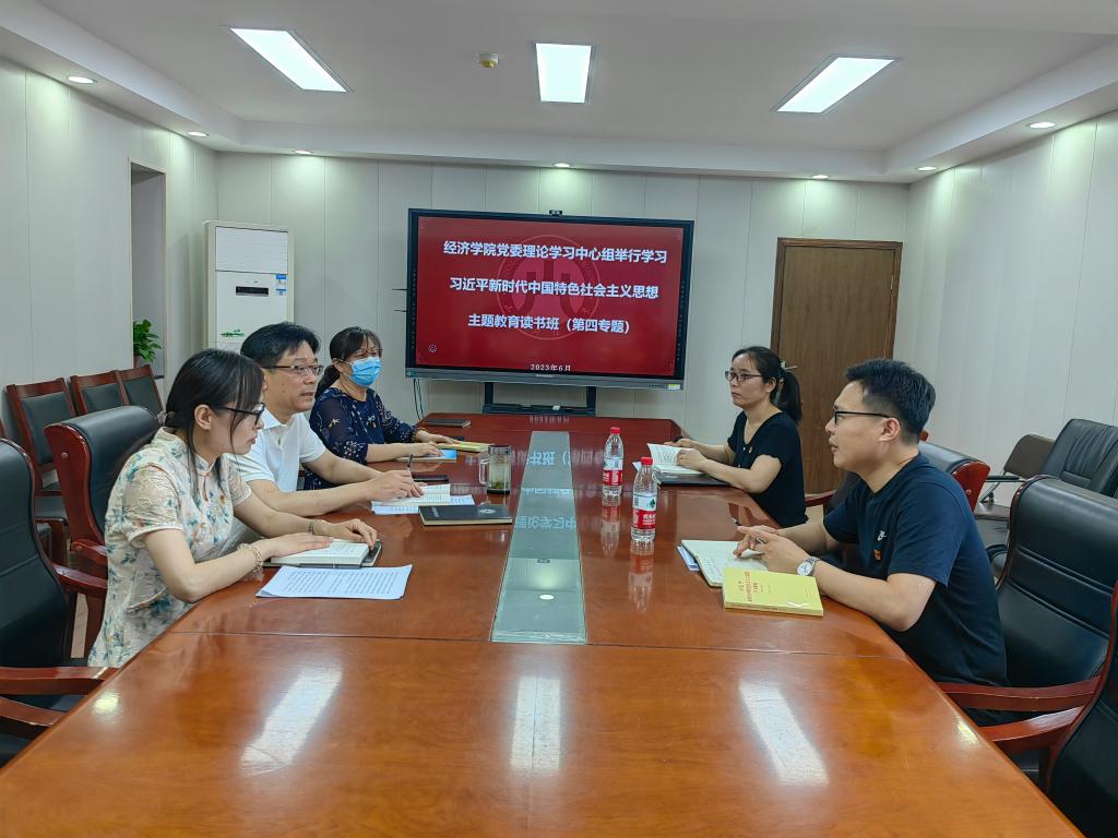 6月8日—9日,经济学院党委理论学习中心组主题教育读书班以“正确理解和大力推进中国式现代化”为专题进行第四次集体学习,重点系统学习了《习近平新时代中国特色社会主义思想学习纲要》一书和5月29日习近平总书记在中共中央政治局第五次集体学习时关于教育强国建设的重要论述。校主题教育工作办公室刘思峰、李亚列会指导。读书班由党委书记姜伟主持,全体班子成员参加学习。